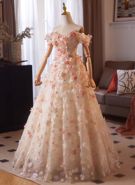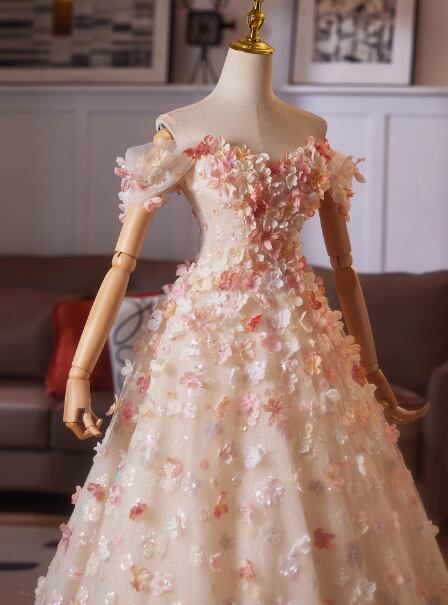 カラードレス 薄ピンク オフショルダー 3D立体花レース刺繍 シークインチュール 花嫁 抜群のおしゃれ見え