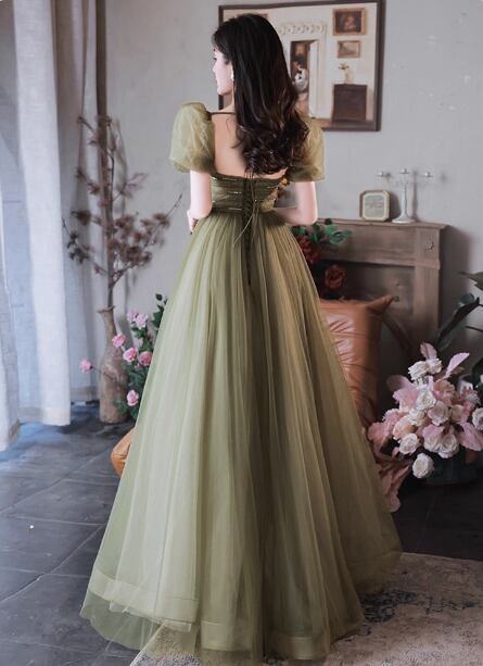 カラードレス グリーン キラキラスパンコール パフスリーブ ロング 揺らめく裾 披露宴