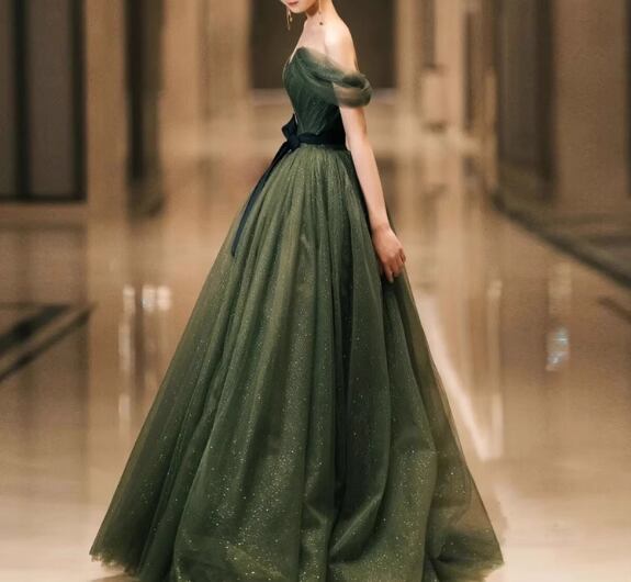 カラードレス グリーン オフショルダー キラキラチュール ふわふわドレス 演奏会/音楽会