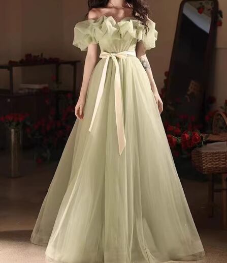 カラードレス ミントグリーン オフショルダー チュールスカート サッシュベルト 音楽会/発表会