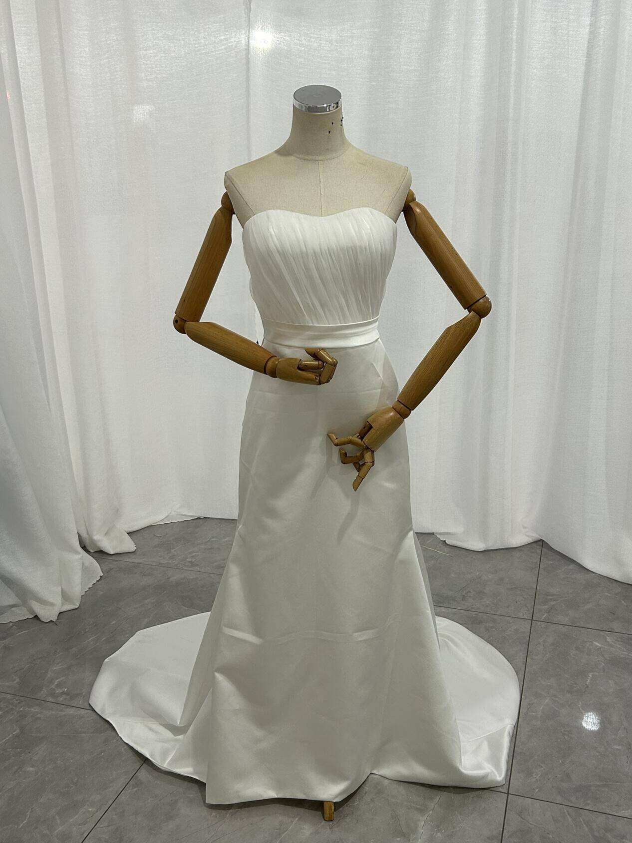 実例写真!ウエディングドレス ベアトップ 光沢サテン 豪華なバックリボン 編み上げ 拳式/前撮り