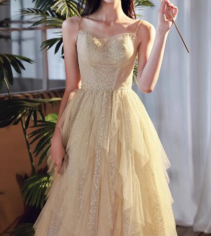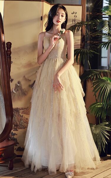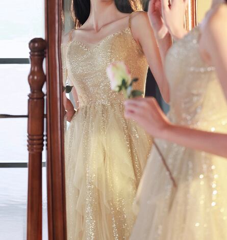 シャンパン色 カラードレス キャミソール シークインチュール ラッフルフリル 披露宴