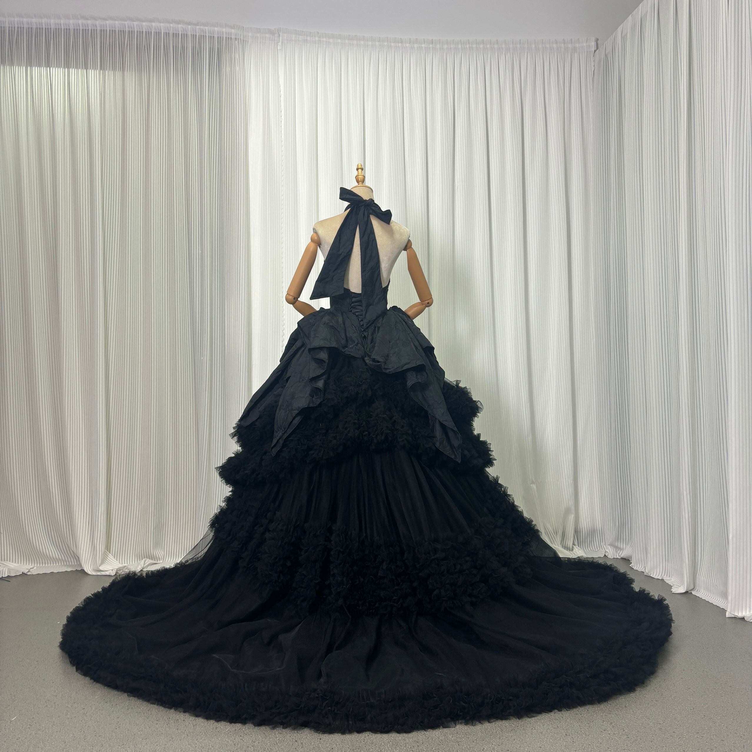 カラードレス ブラック ホルターネック 背中見せ リボントレーン ボリュームドレス ジャガード生地 花嫁