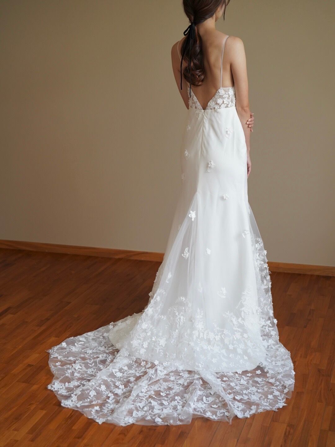 実例写真!優しい ウェディングドレス Vネック 花モチーフ キャミソール マーメイドライン 前撮り優しい ウェディングドレス Vネック 花モチーフ キャミソール マーメイドライン 前撮り