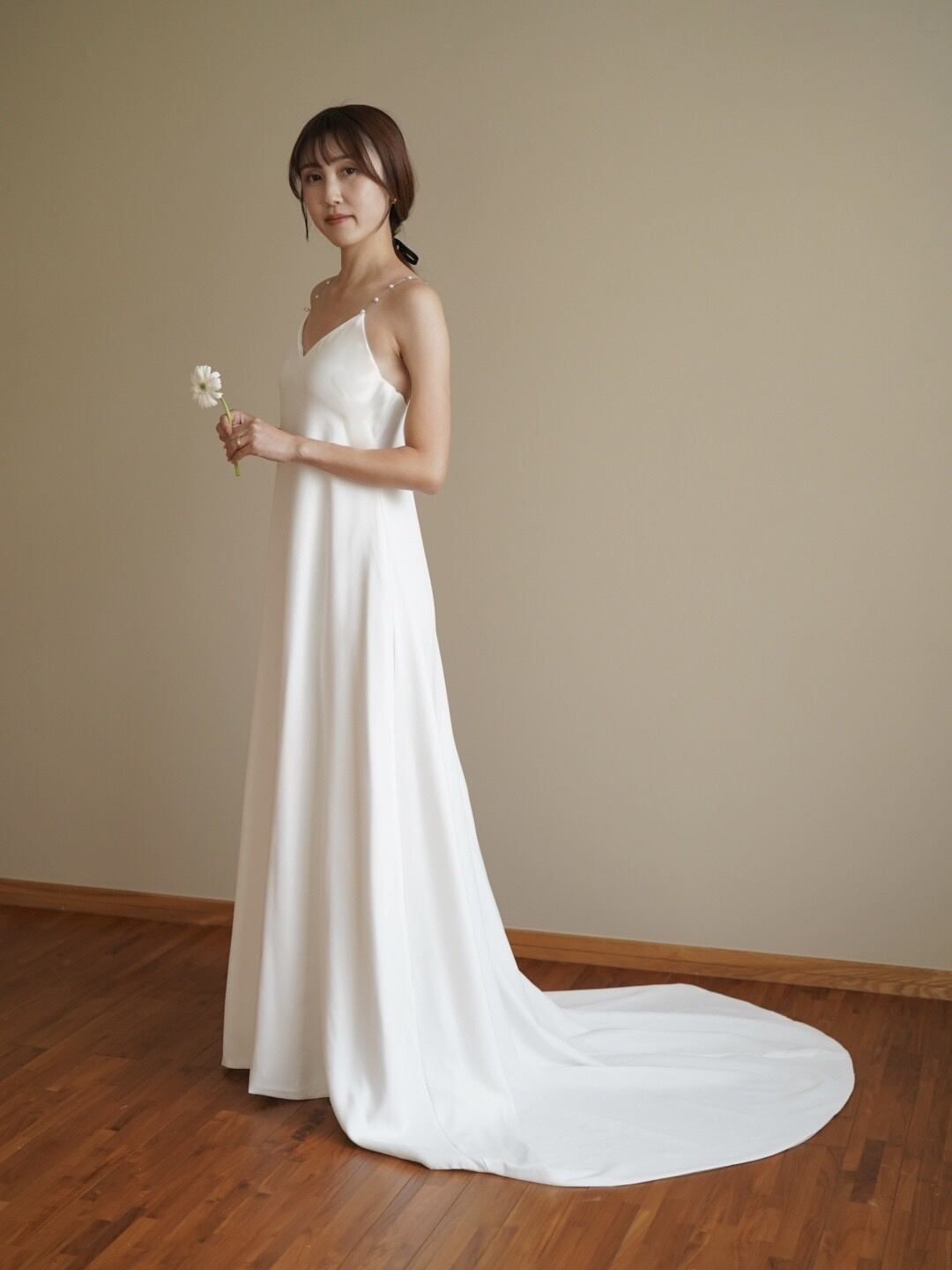 実例写真!パーティードレス ビーズ キャミソール オフホワイト 色直し スレンダーライン 前撮り 二次会