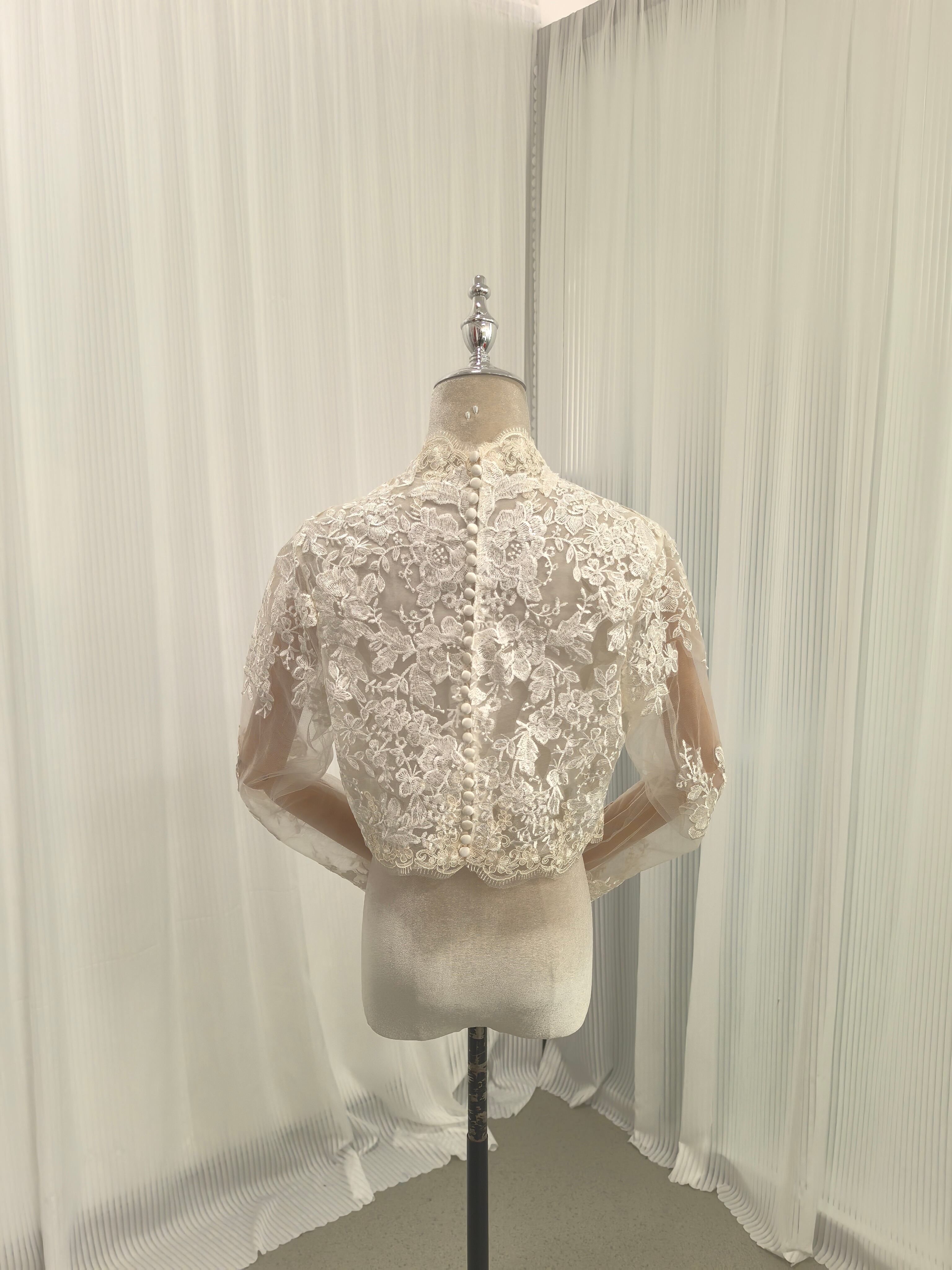 ボレロ アイボリー ハイネック 長袖 キラキラスパンコール くるみボタン 流れる透け花レース 花嫁