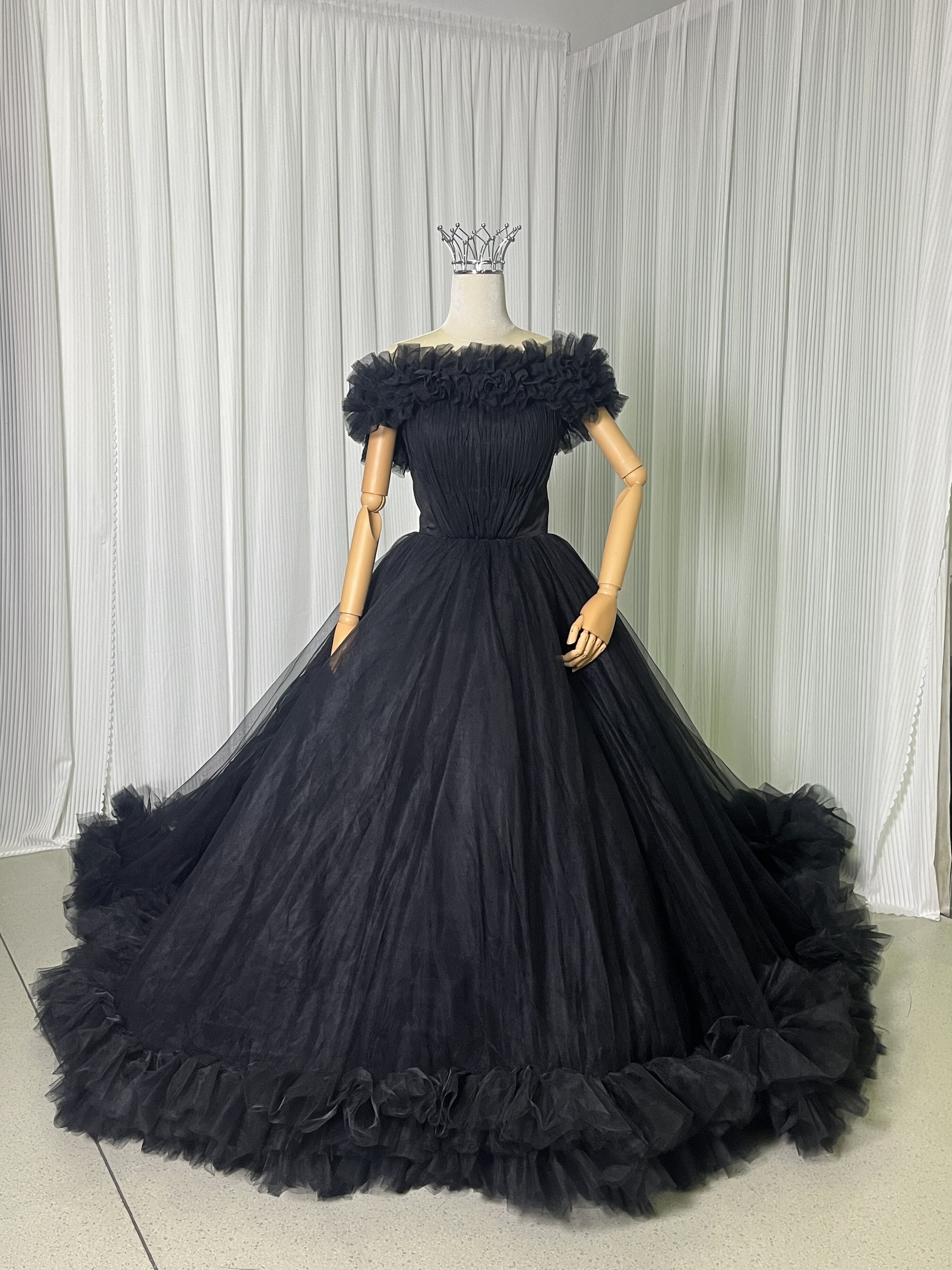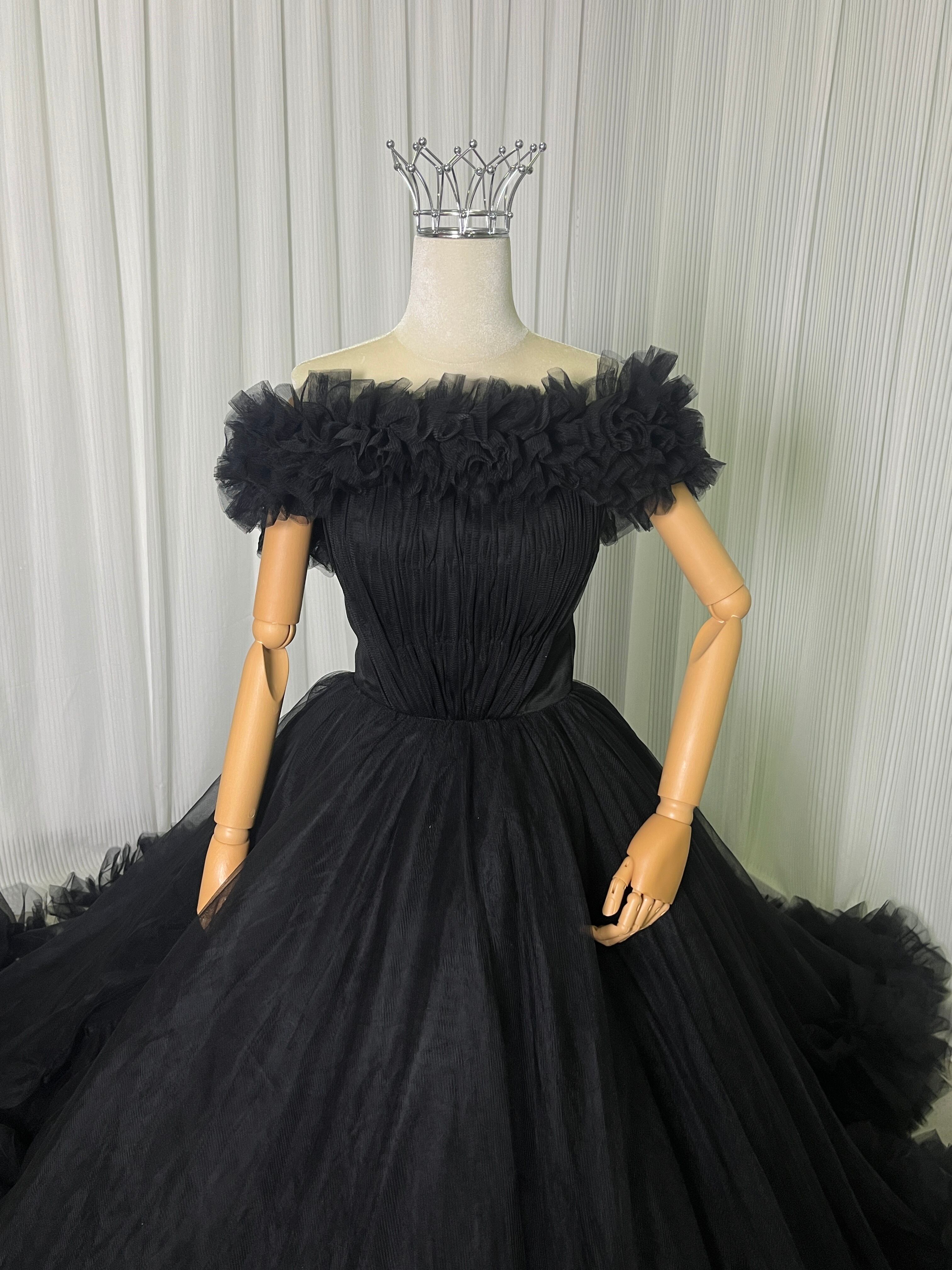 豪華!パーティードレス ブラック 取り外しオフショルダー ラッフルフリル ボリュームドレス 前撮り