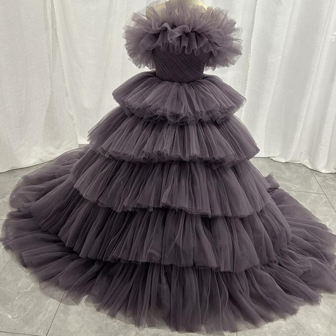 実例写真!カラードレス オーキッド オフショルダー 柔らかく重ねたチュールスカート 結婚式 抜群のおしゃれ見え