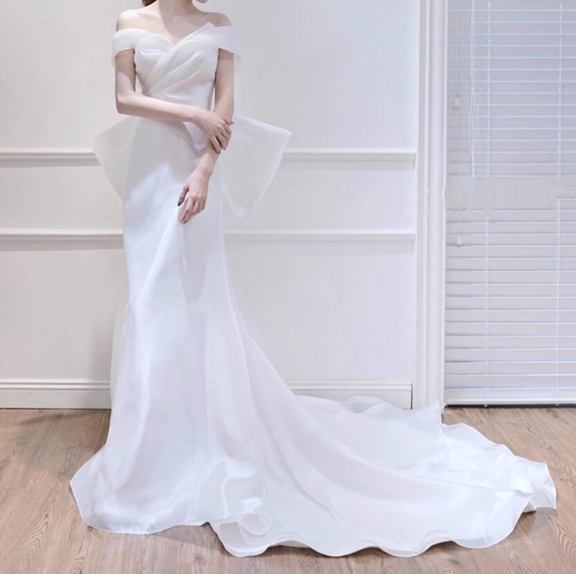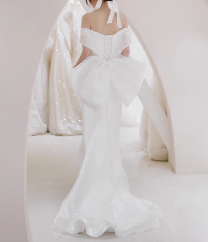 ウェディングドレス オフショルダー 優雅なシルエット 豪華なバックリボン 大人っぽい 結婚式