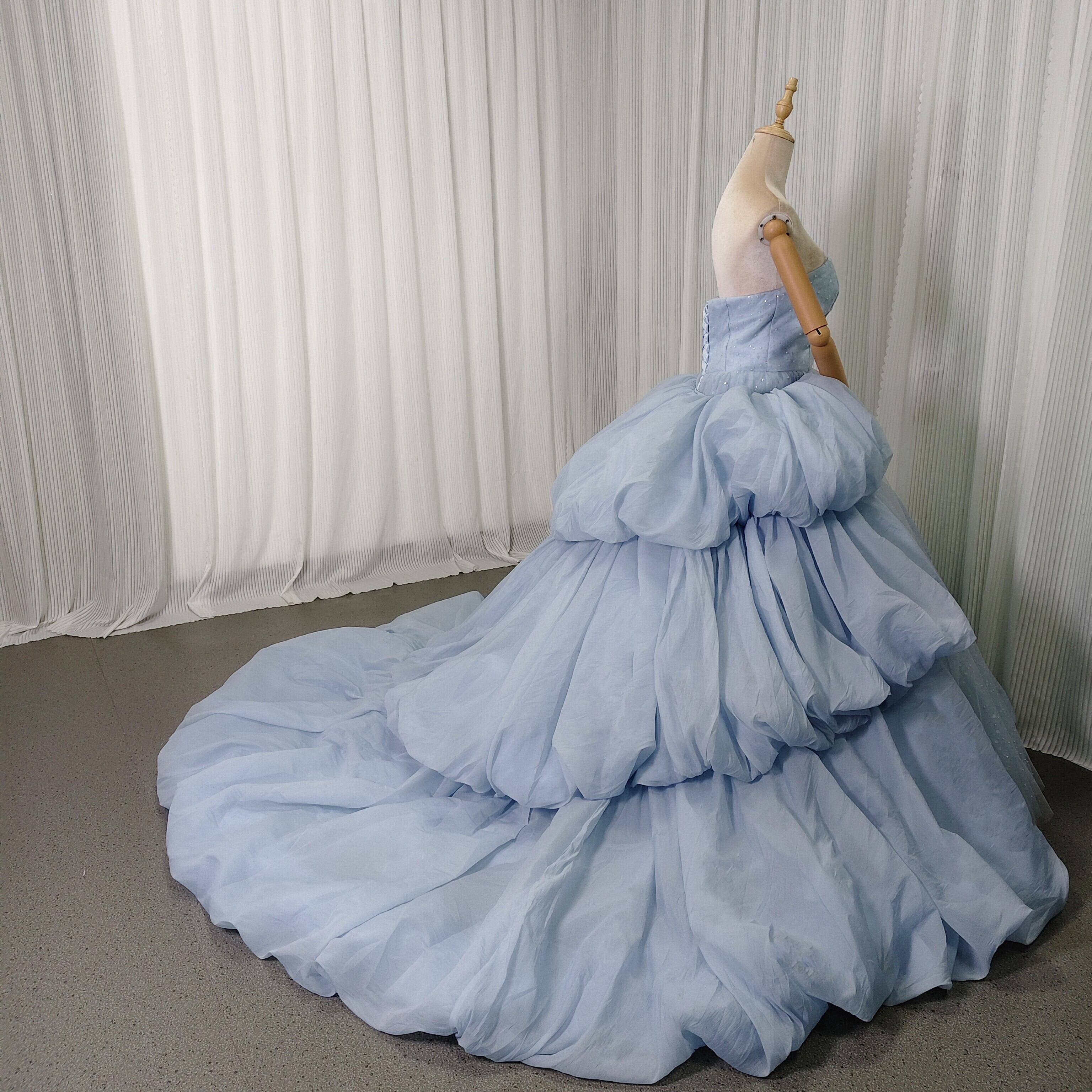 実例写真!カラードレス ブルー ベアトップ 取り外し袖 ラッフルフリル キラキラチュール 前撮り