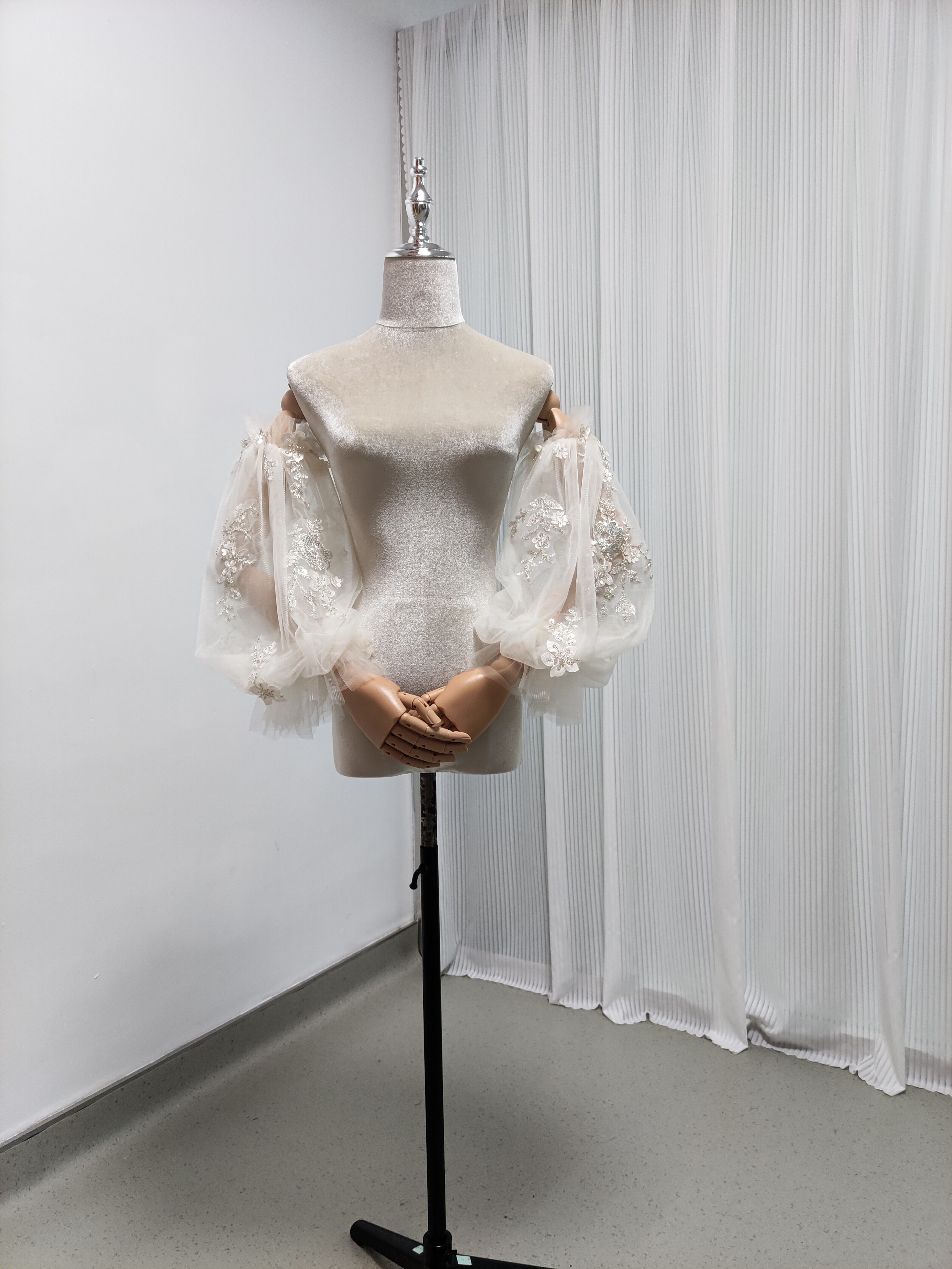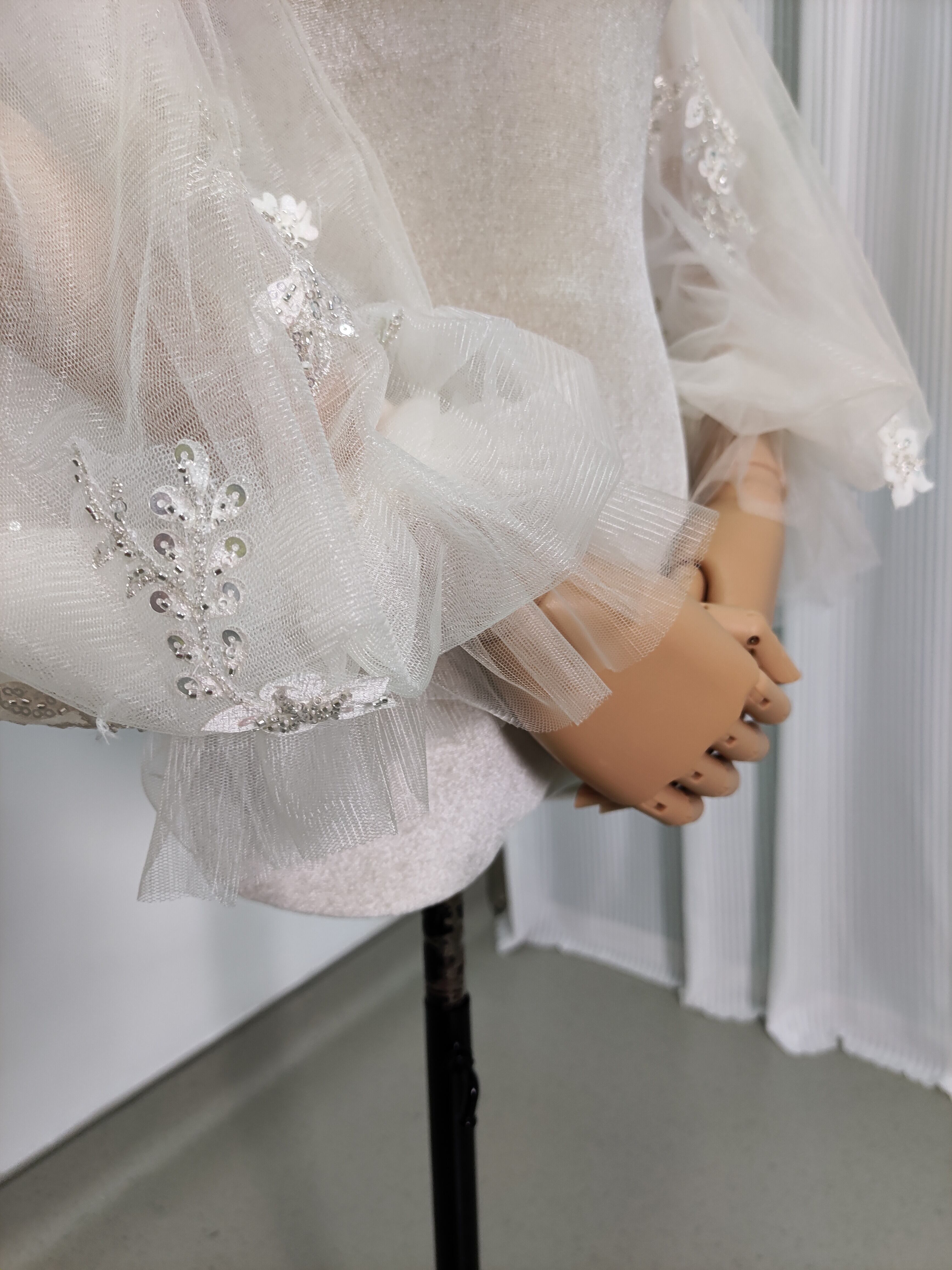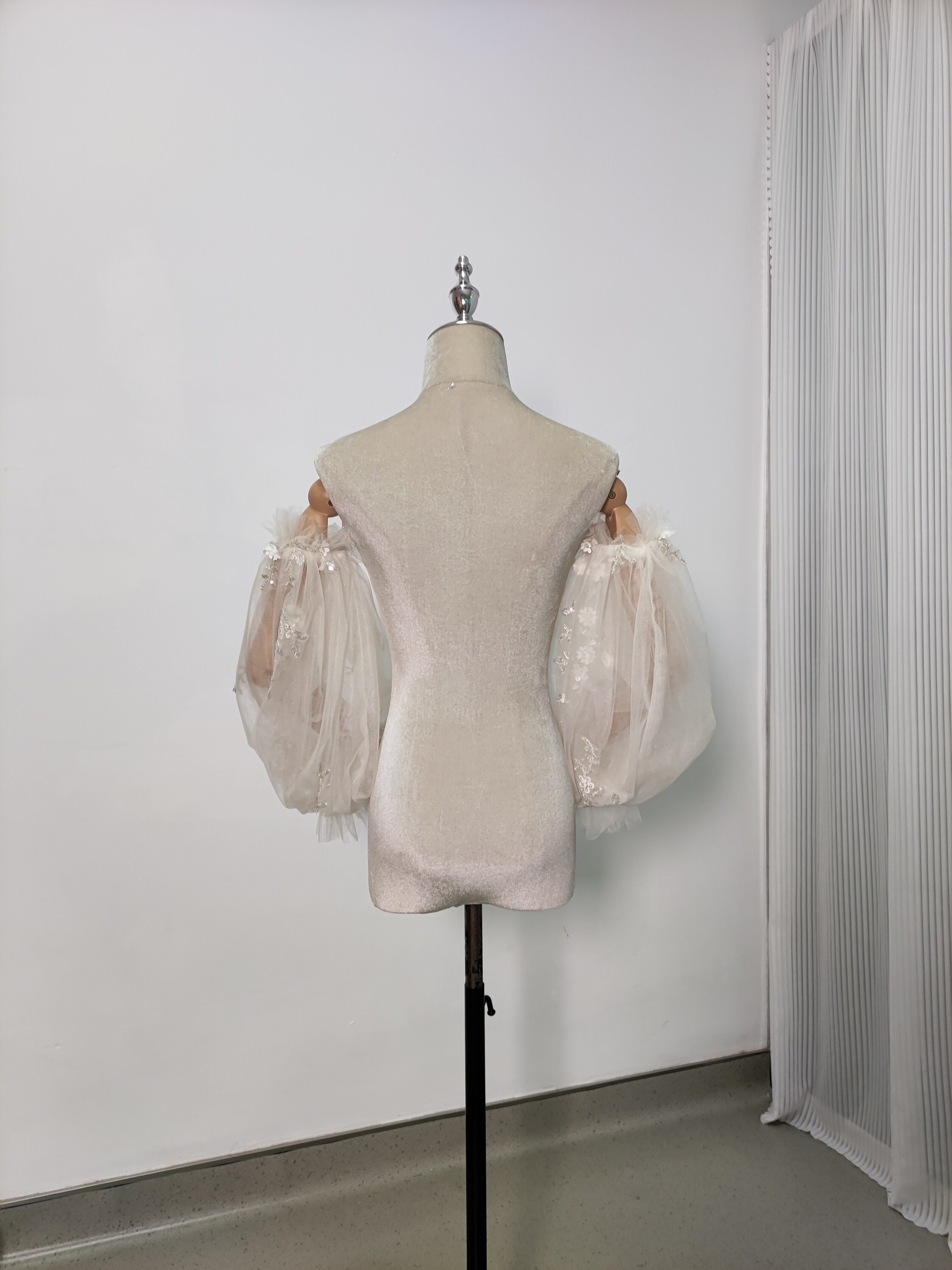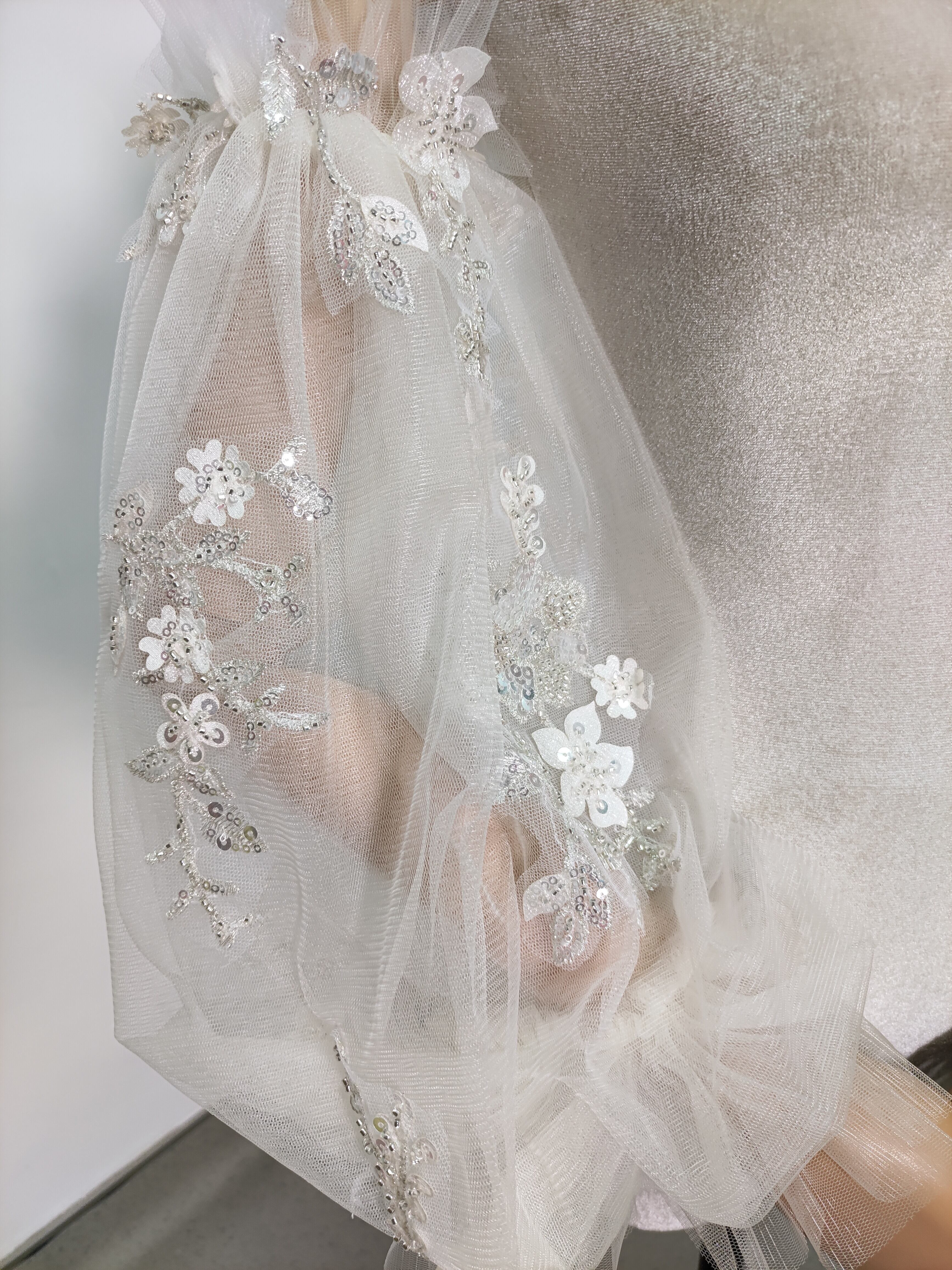 実例写真!パフスリーブのみ 可愛い ソフトチュール キラキラ光る刺繍 ストレッチ ウェディングドレス 前撮り