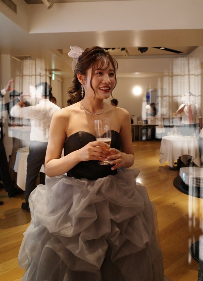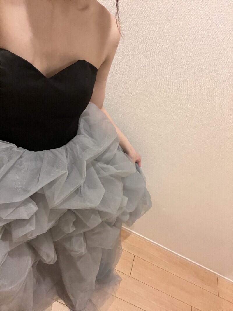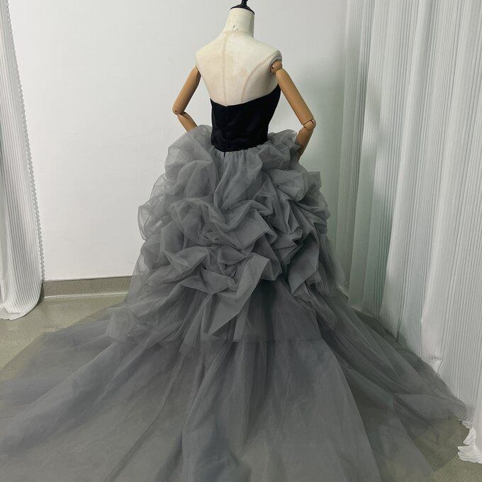 実例写真!カラードレス ベアトップ 黒 グレー ラッフルフリル デザイン感 前撮り フランス風