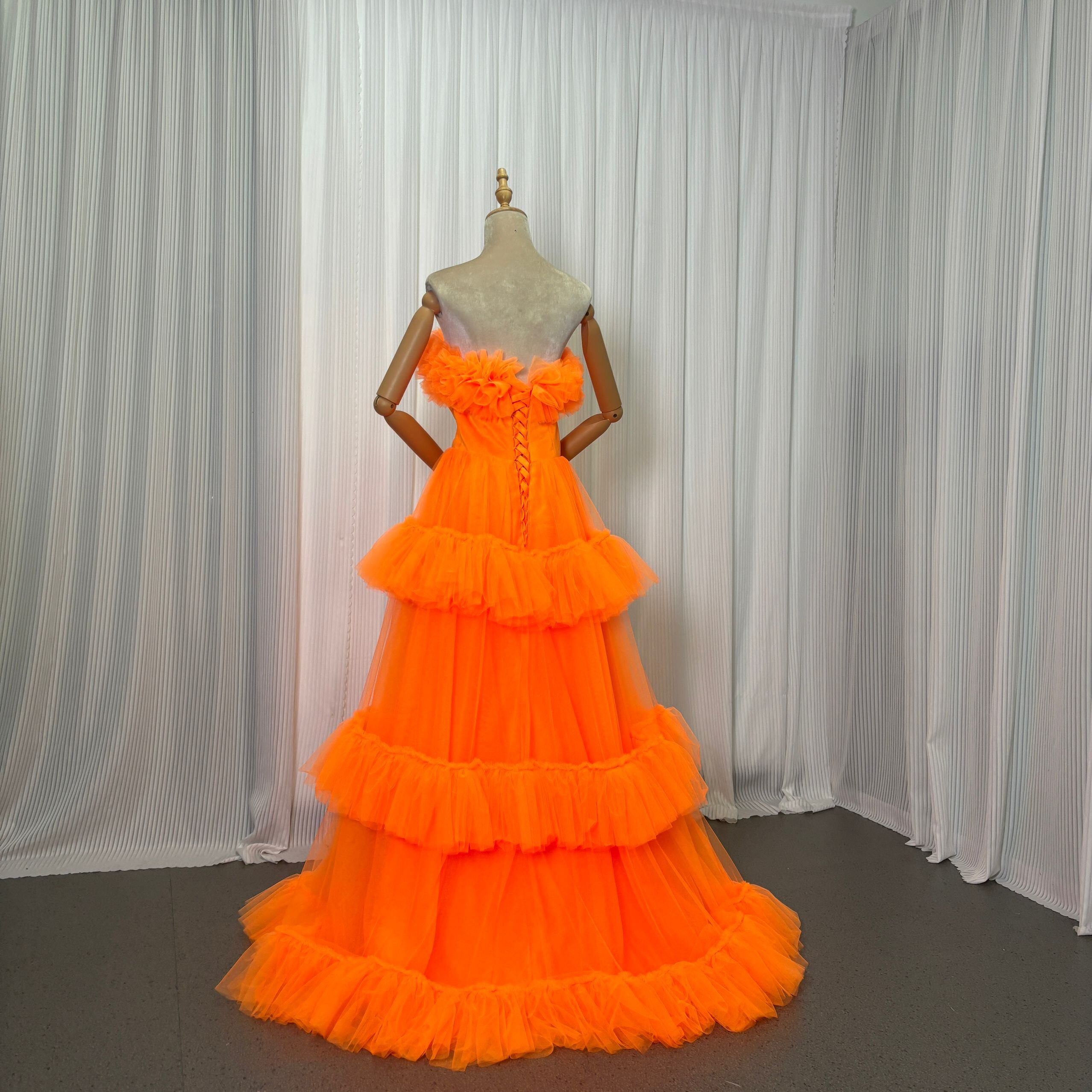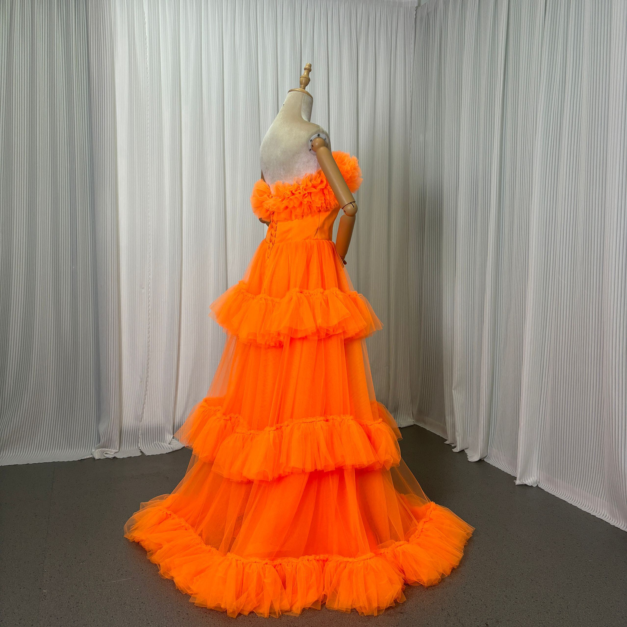 フランス風 カラードレス オレンジ ベアトップ フロントスリット ふわふわドレス 編み上げ 2次会