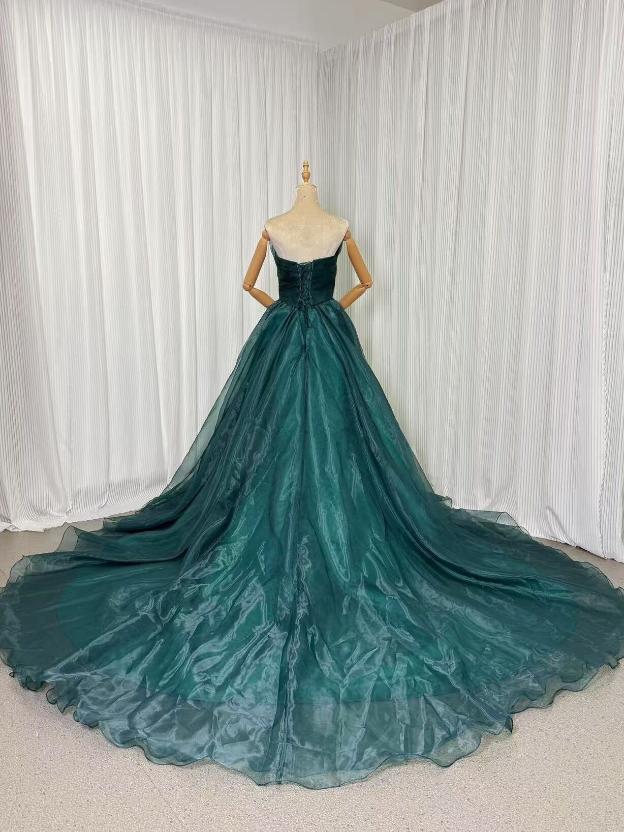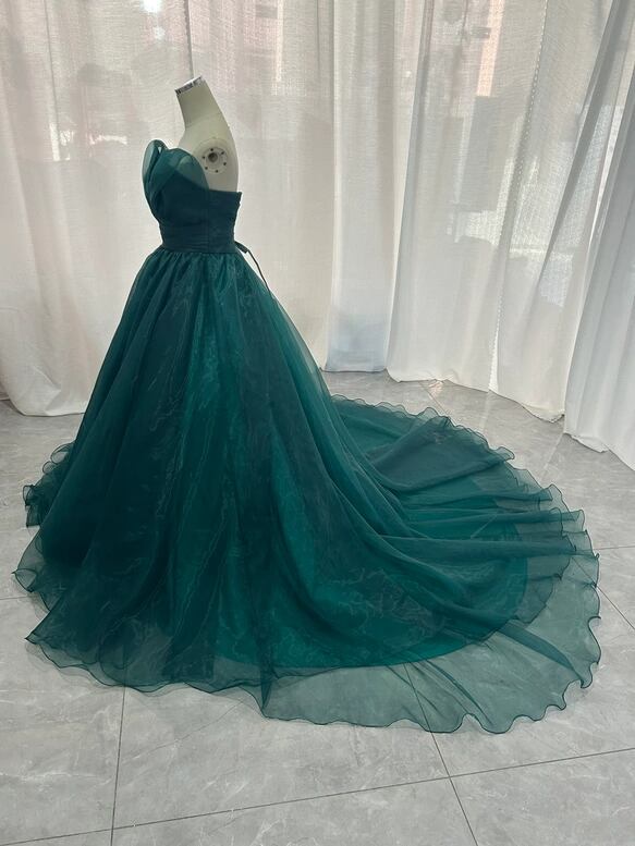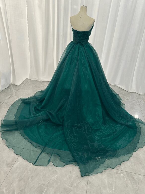 実例写真!カラードレス ブルー ベアトップ 上質オーガンジー ロングトレーン 編み上げ 花嫁