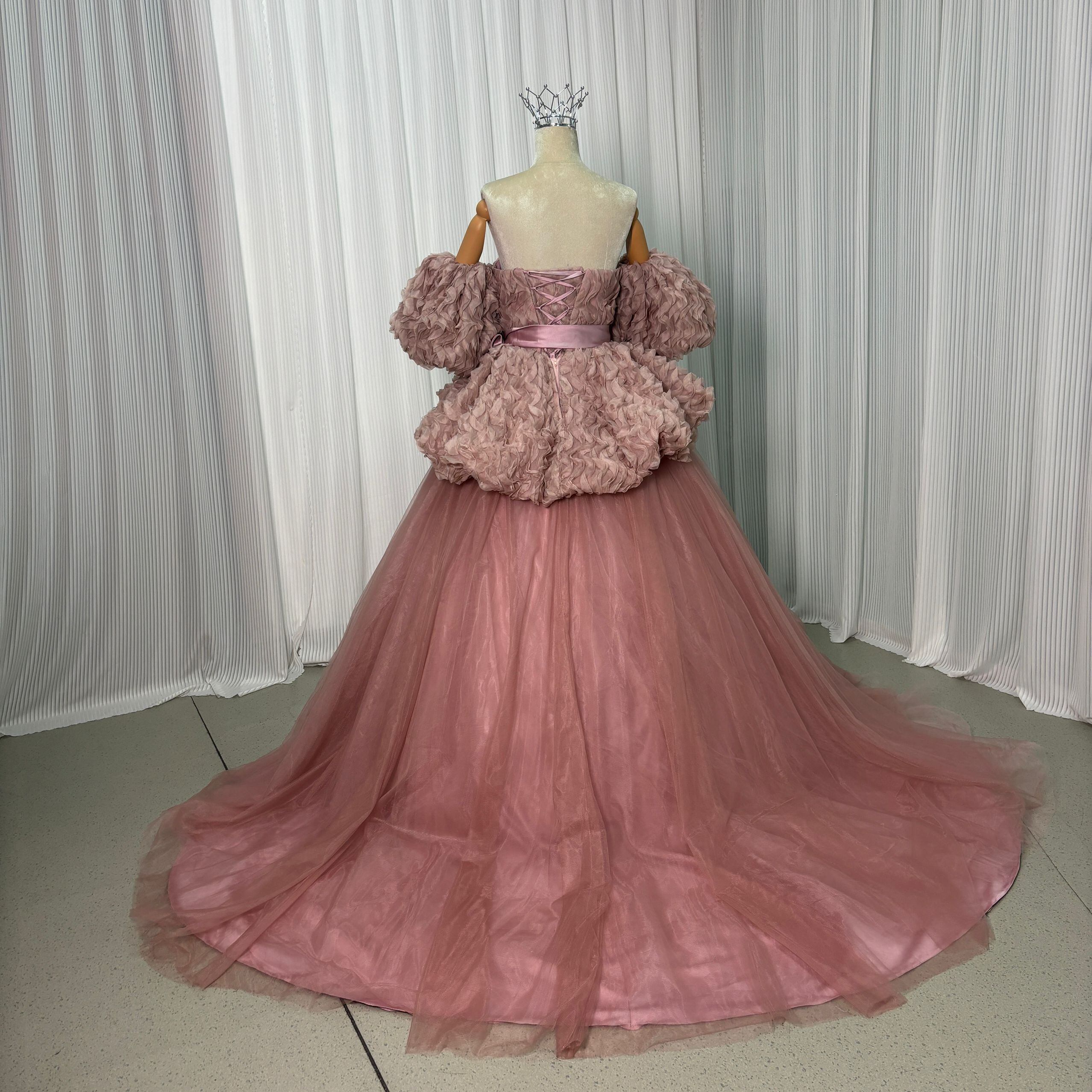 実例写真!カラードレス ピンク パフスリーブ 可愛い プリンセスライン もこもこドレス 編み上げ 花嫁