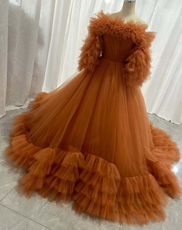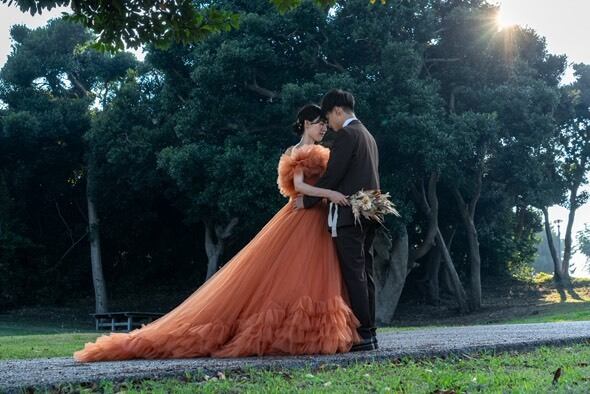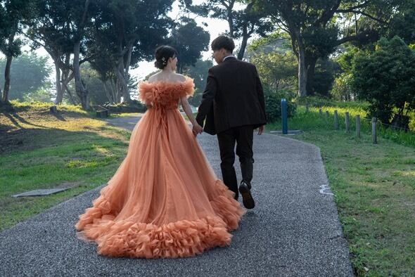 実例写真!カラードレス オレンジ 取り外しオフショルダー フリル袖 華やかなトレーン 編み上げ 前撮り