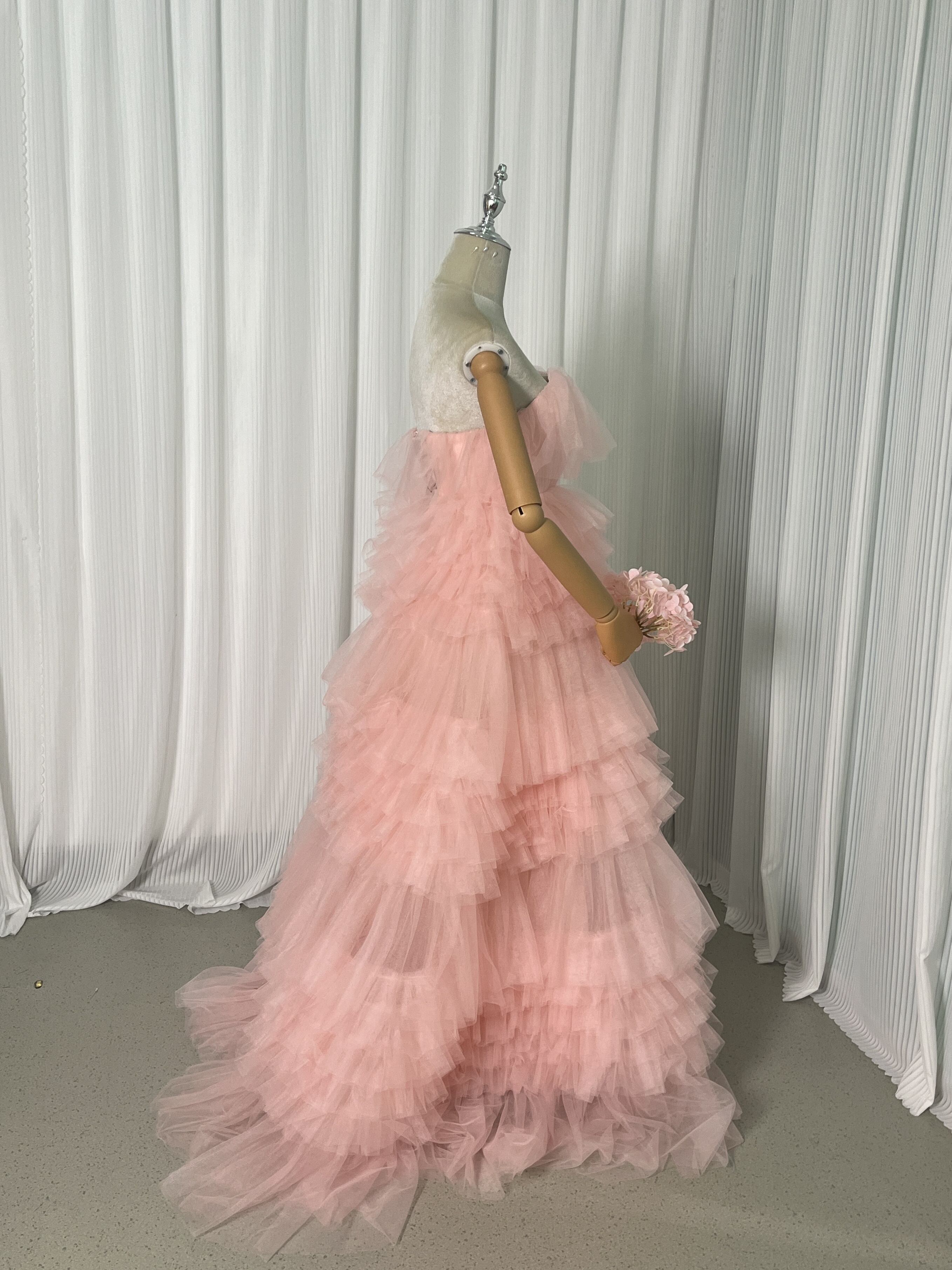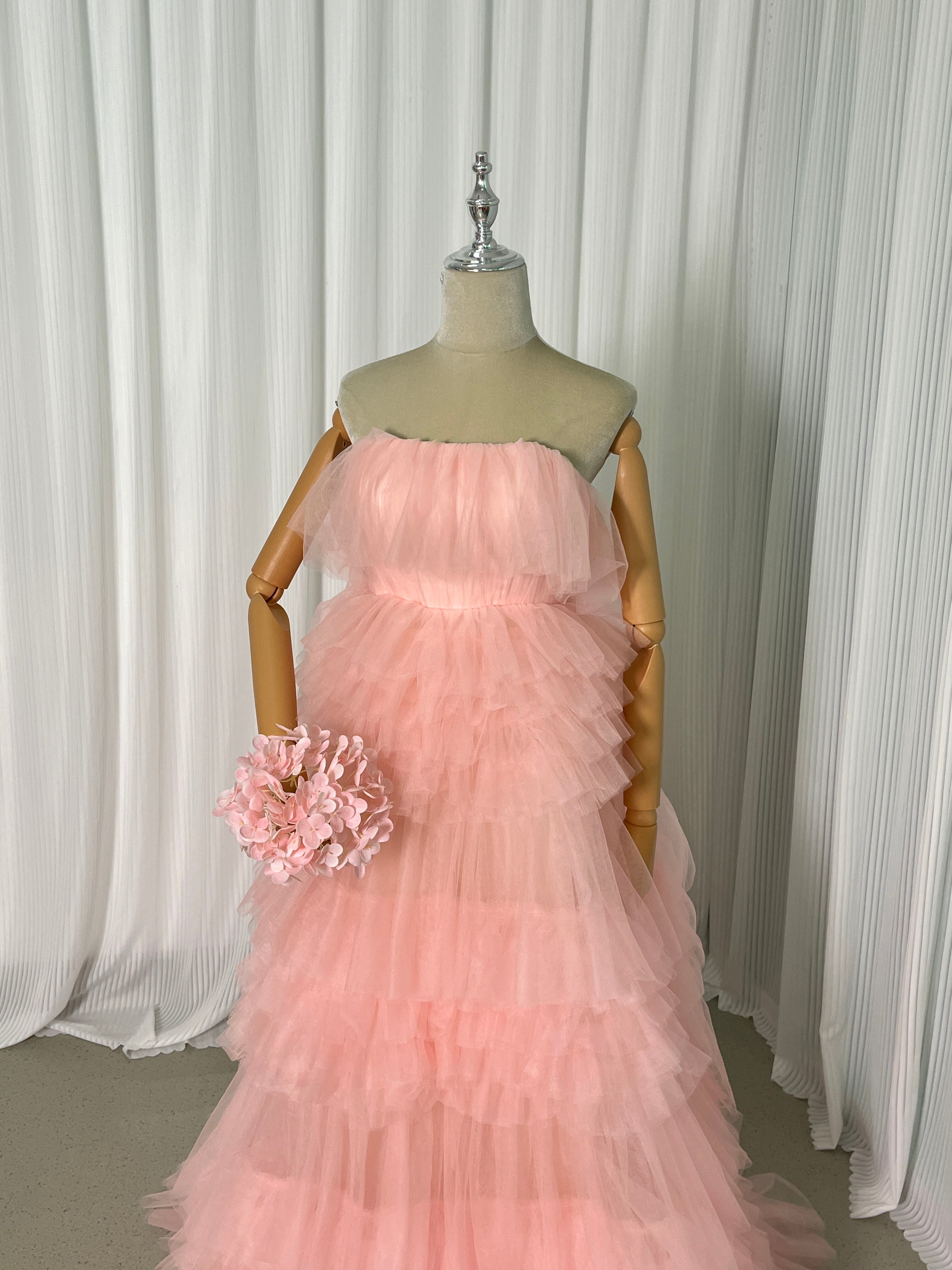 美品!カラードレス ピンク ベアトップ 柔らかく重ねたチュールスカート 編み上げ 細見えシルエット 花嫁