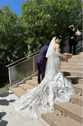 実例写真!ウェディングドレス ベアトップ 流れる透け花レース マーメイドライン 華やかなトレーン 拳式