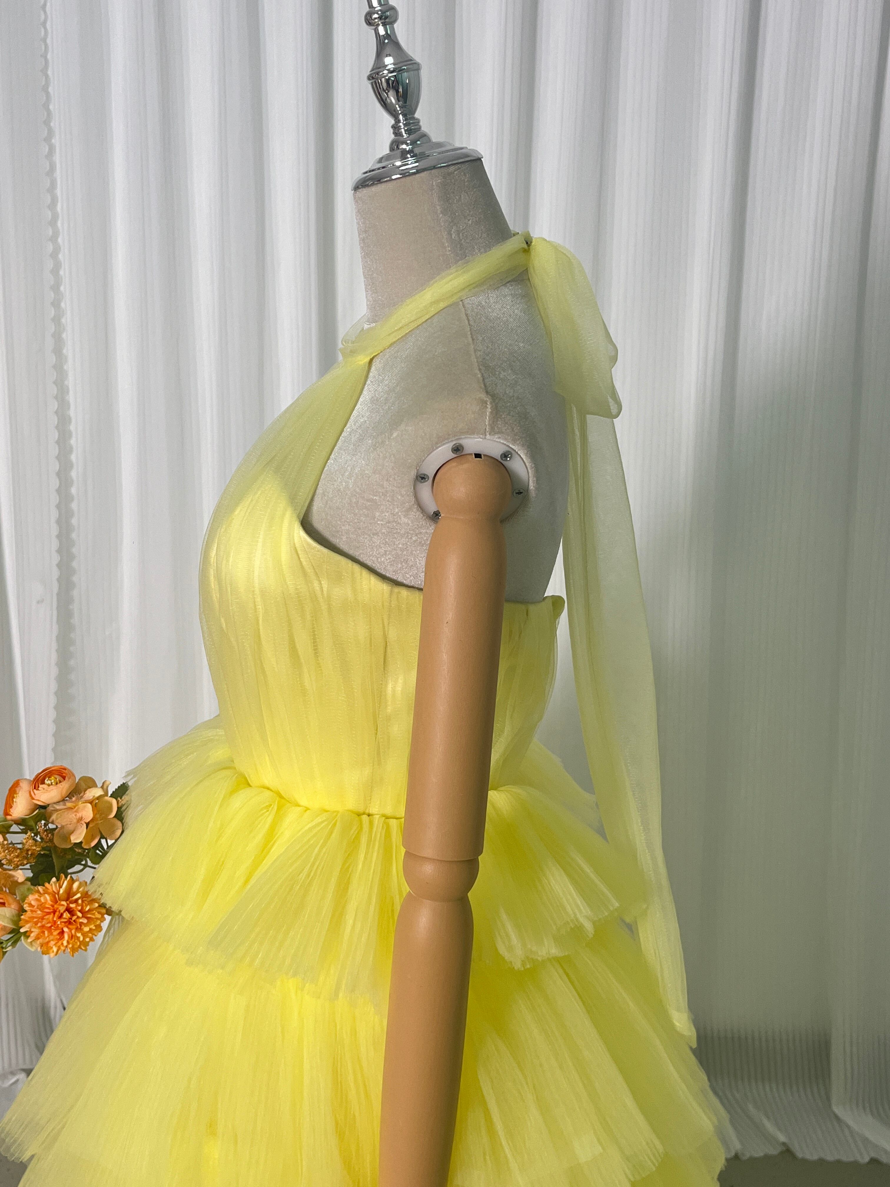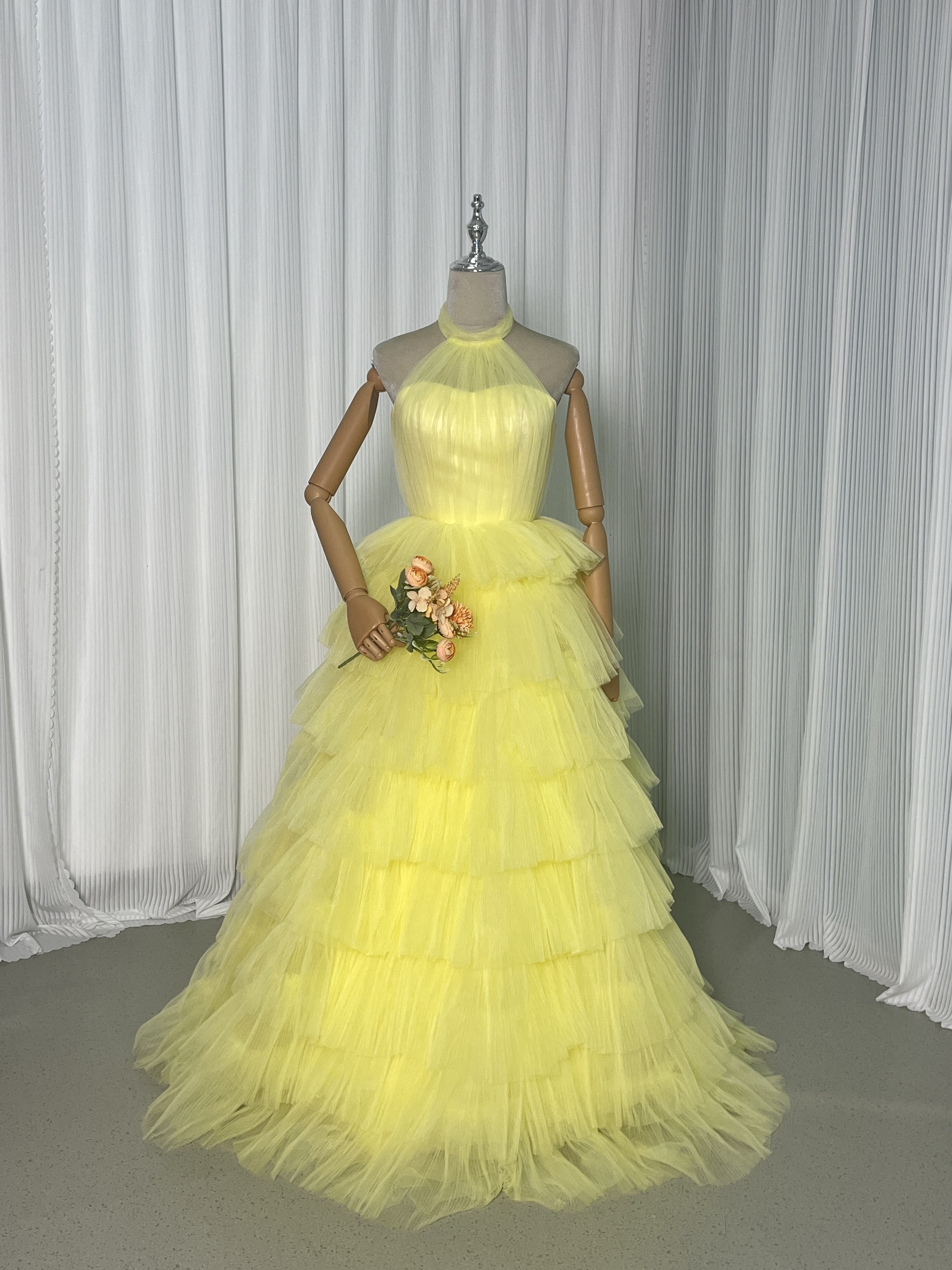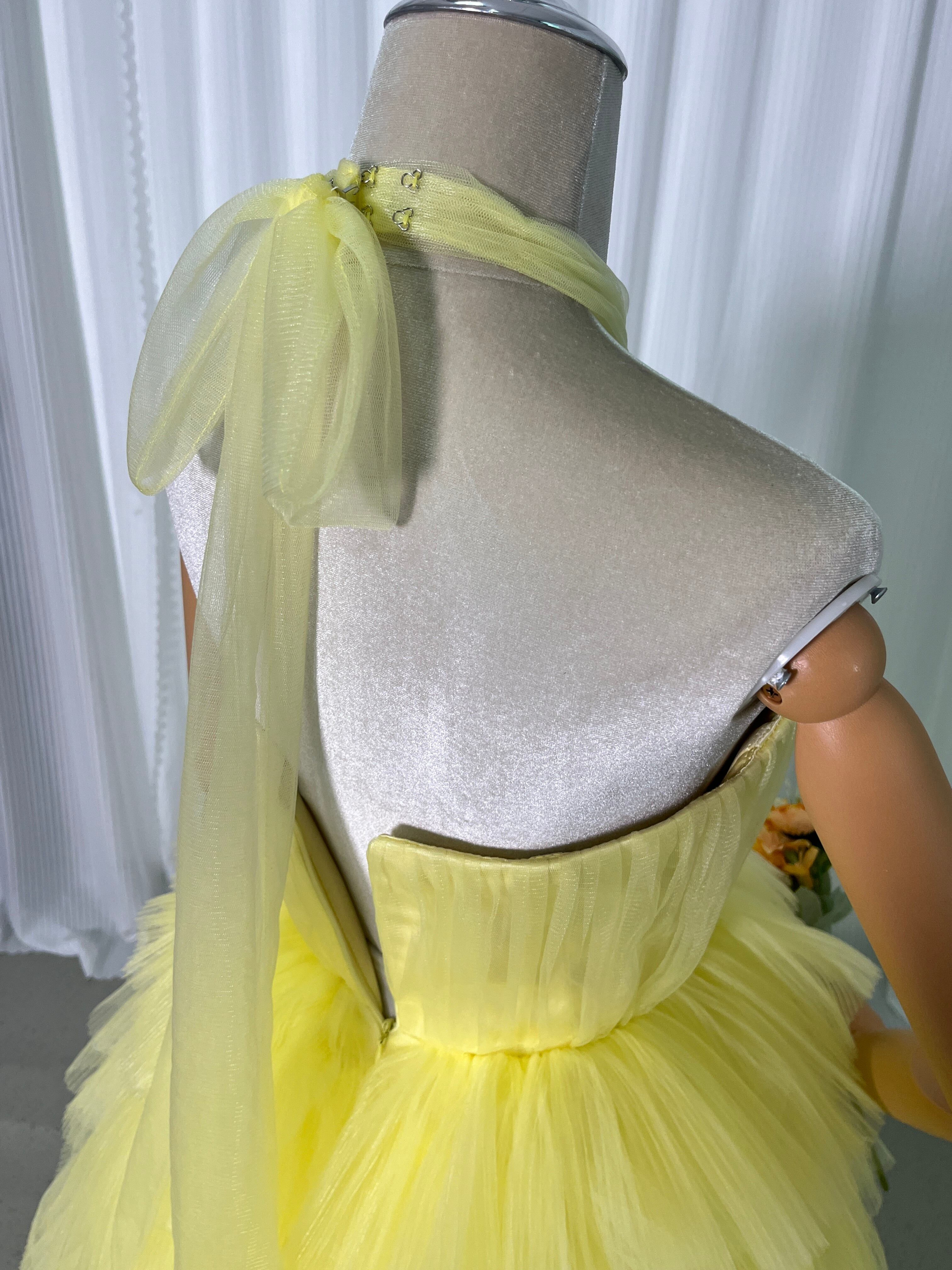 人気上昇!パーティードレス イエロー ホルターネック プリーツスカート ファスナー 前撮り 抜群のおしゃれ見え