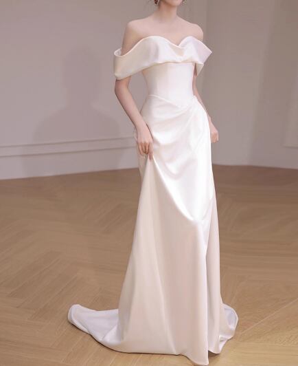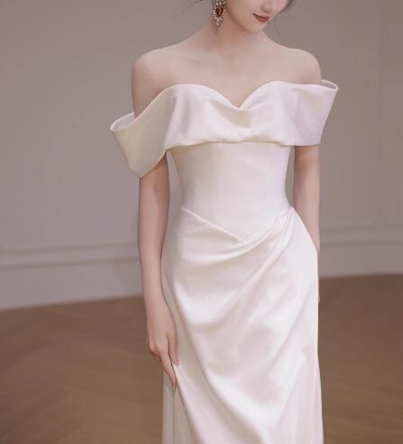 ウエディングドレス オフショルダー 光沢サテン 優雅なシルエット 大人っぽい エレガント 結婚式