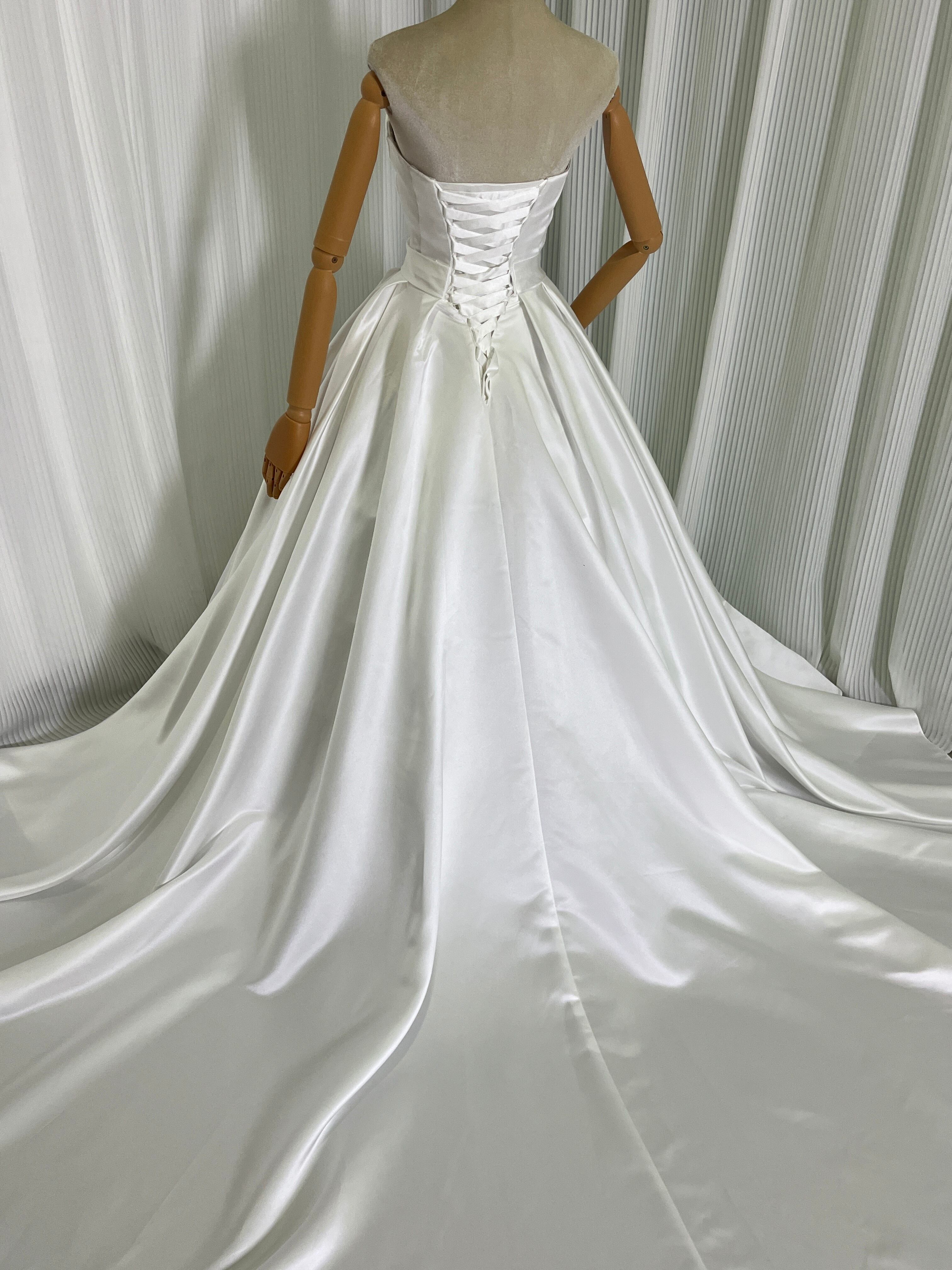 ウエディングドレス 光沢サテン ベアトップ オフショルダー フリル袖 リボン ロングトレーン 編み上げ 結婚式