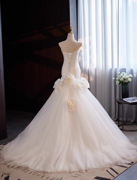 ウエディングドレス ベアトップ マーメイドライン 花モチーフ ふわふわドレス 編み上げ 結婚式