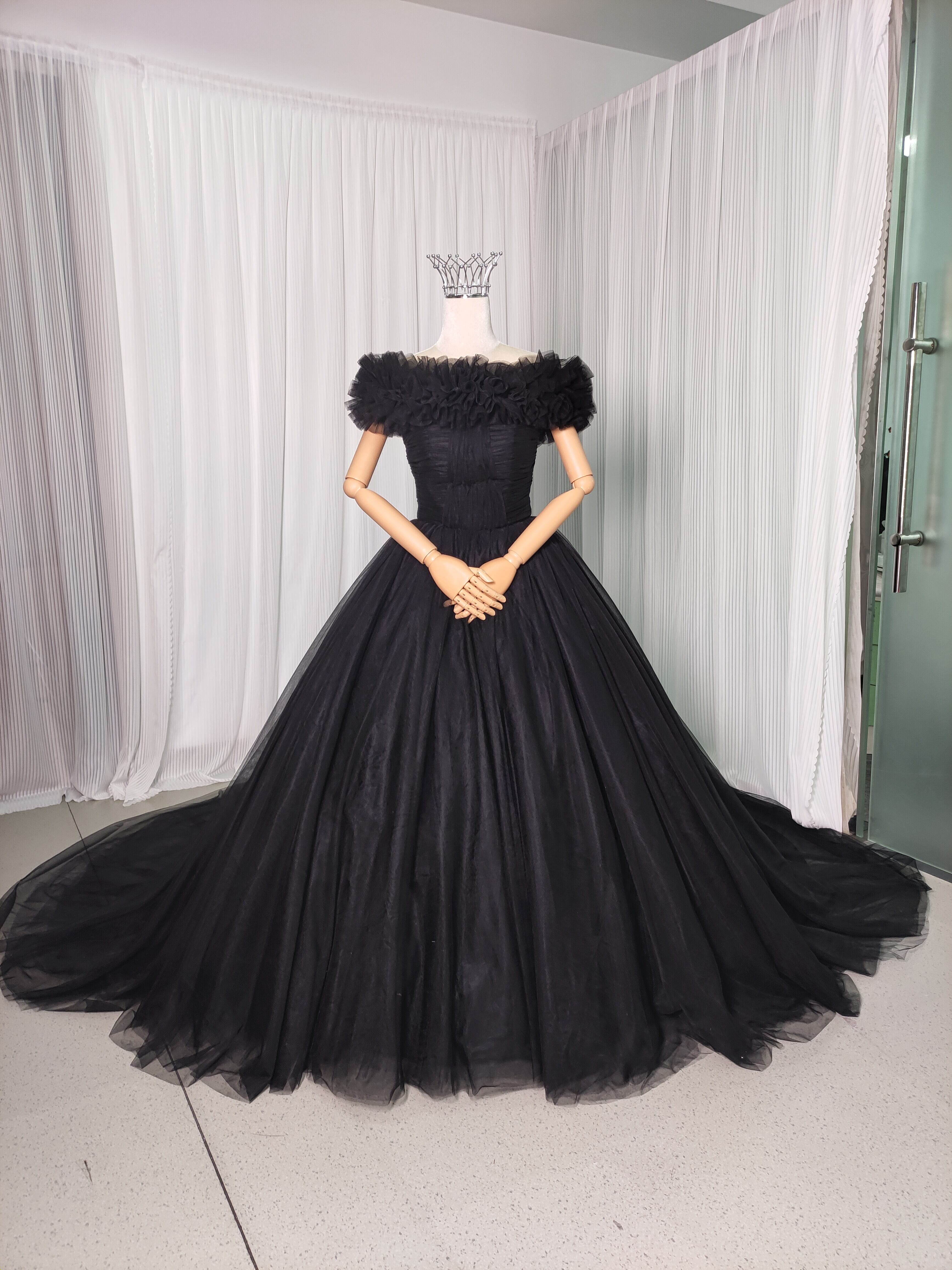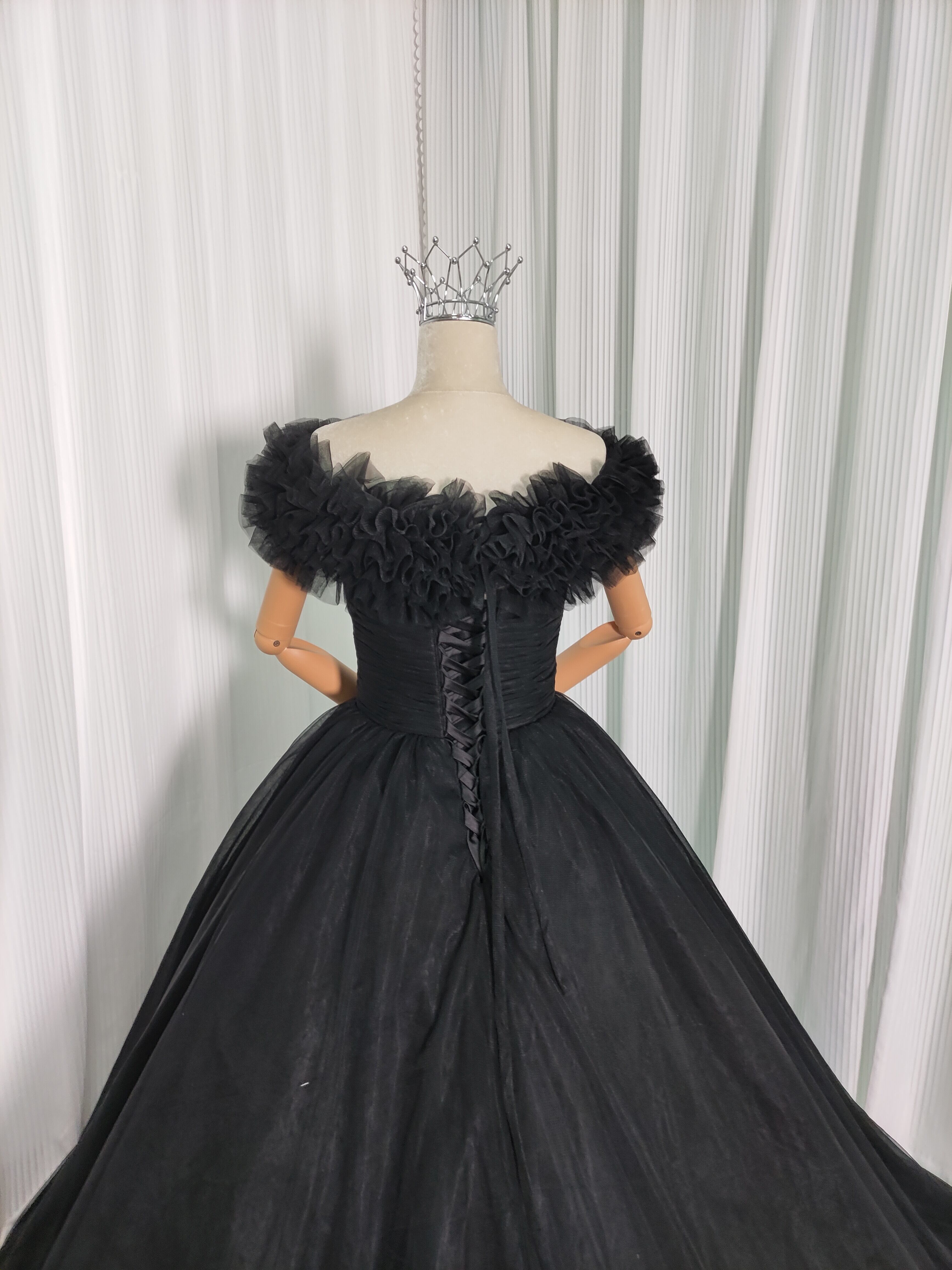 カラードレス ブラック 取り外しオフショルダー チュールスカート エレガント 編み上げ 披露宴