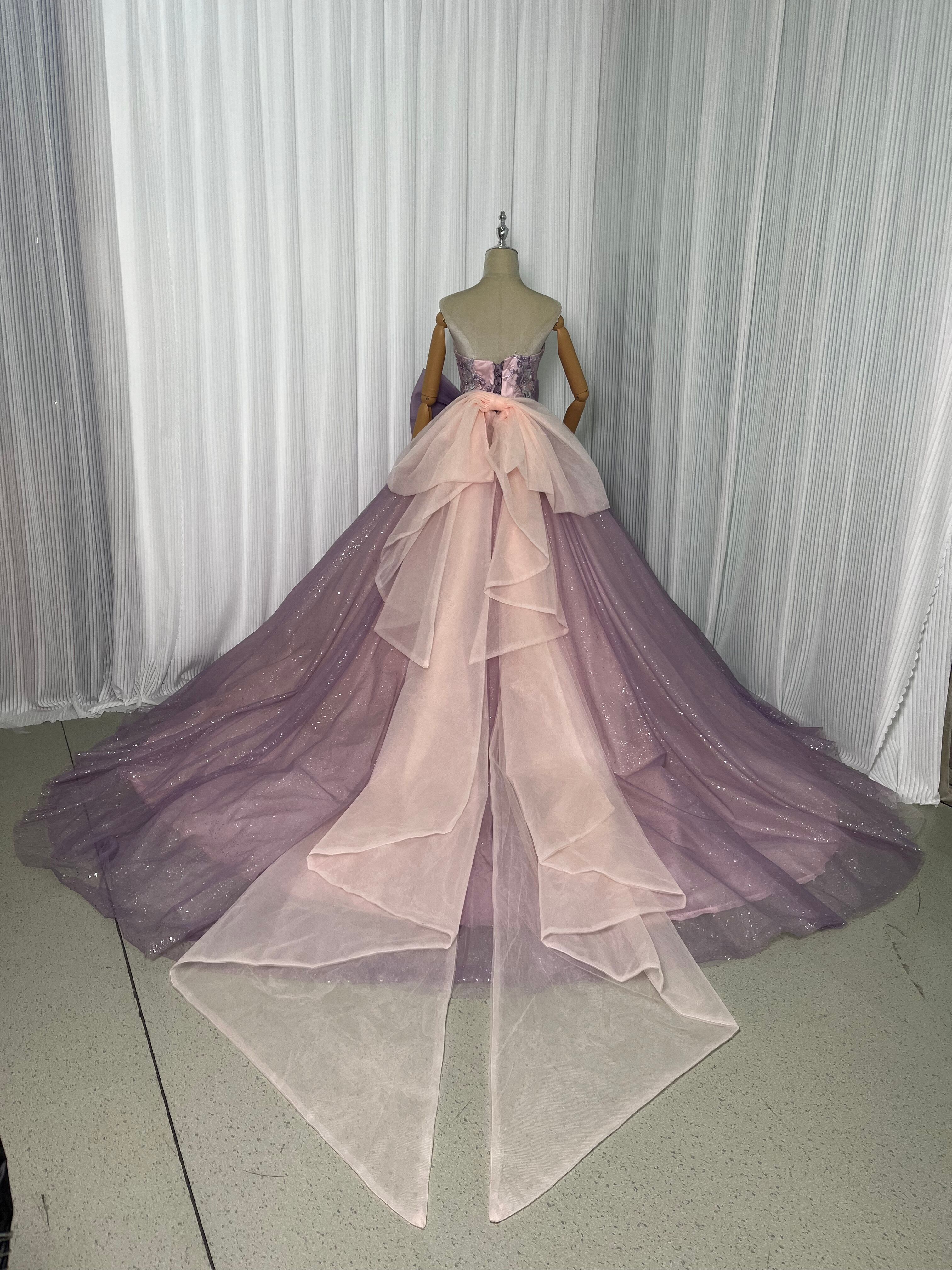 カラードレス パープル ベアトップ 3D立体レース刺繍 編み上げ 豪華なバックリボン キラキラチュール 派手な 花嫁