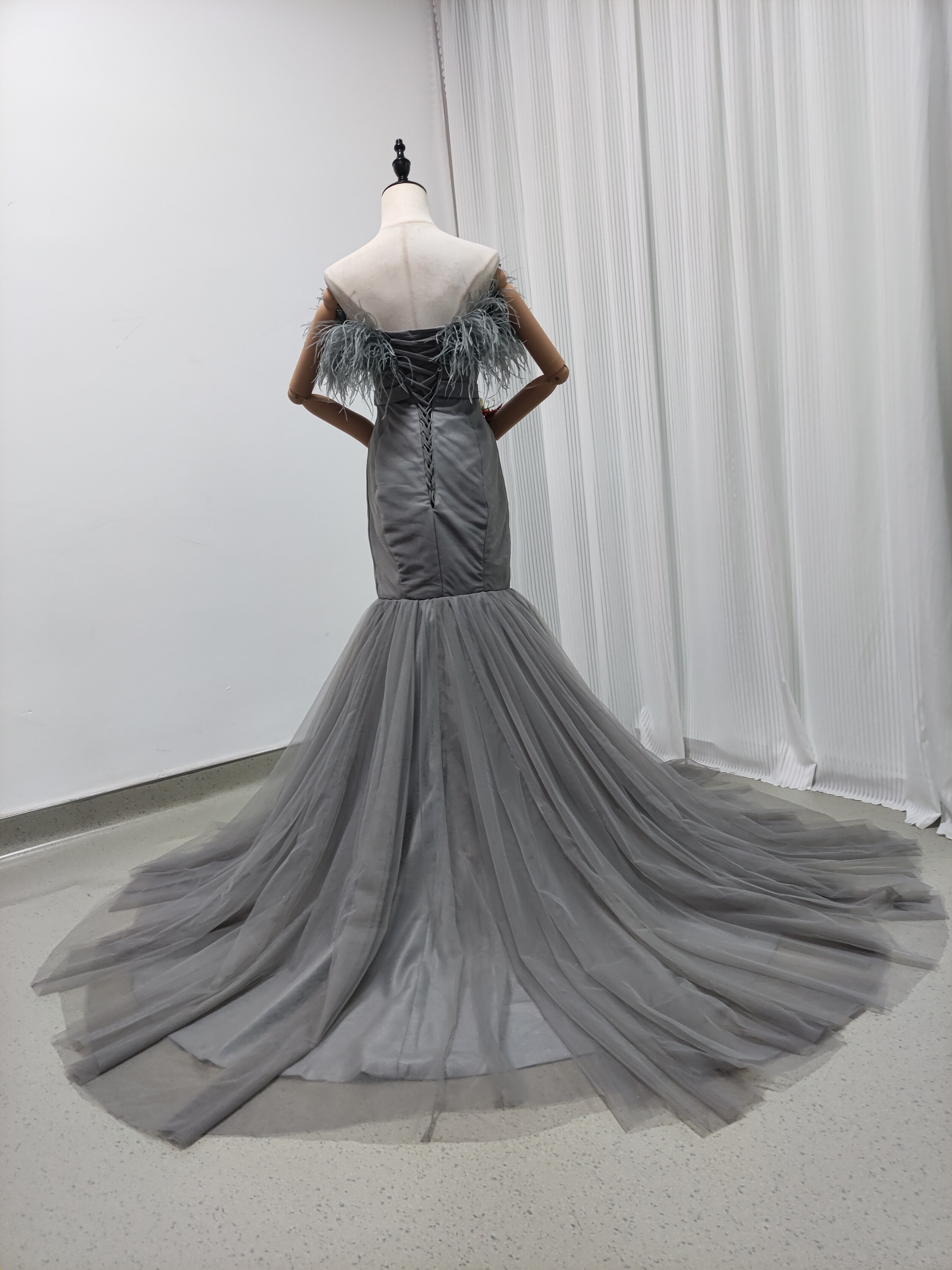 実例写真!カラードレス グレー フェザードレス ソフトチュール マーメイドライン デザイン感 ブライダル 花嫁