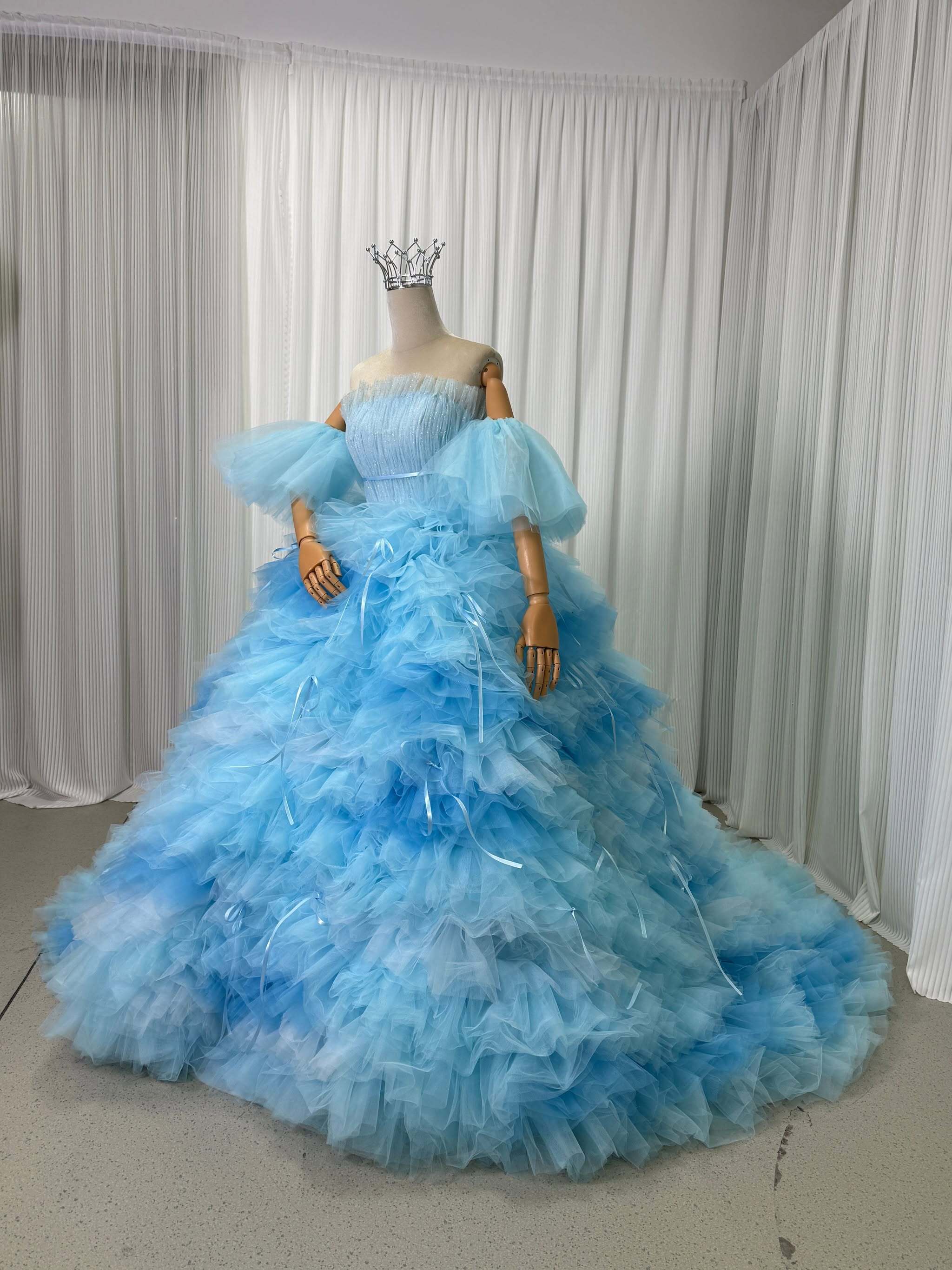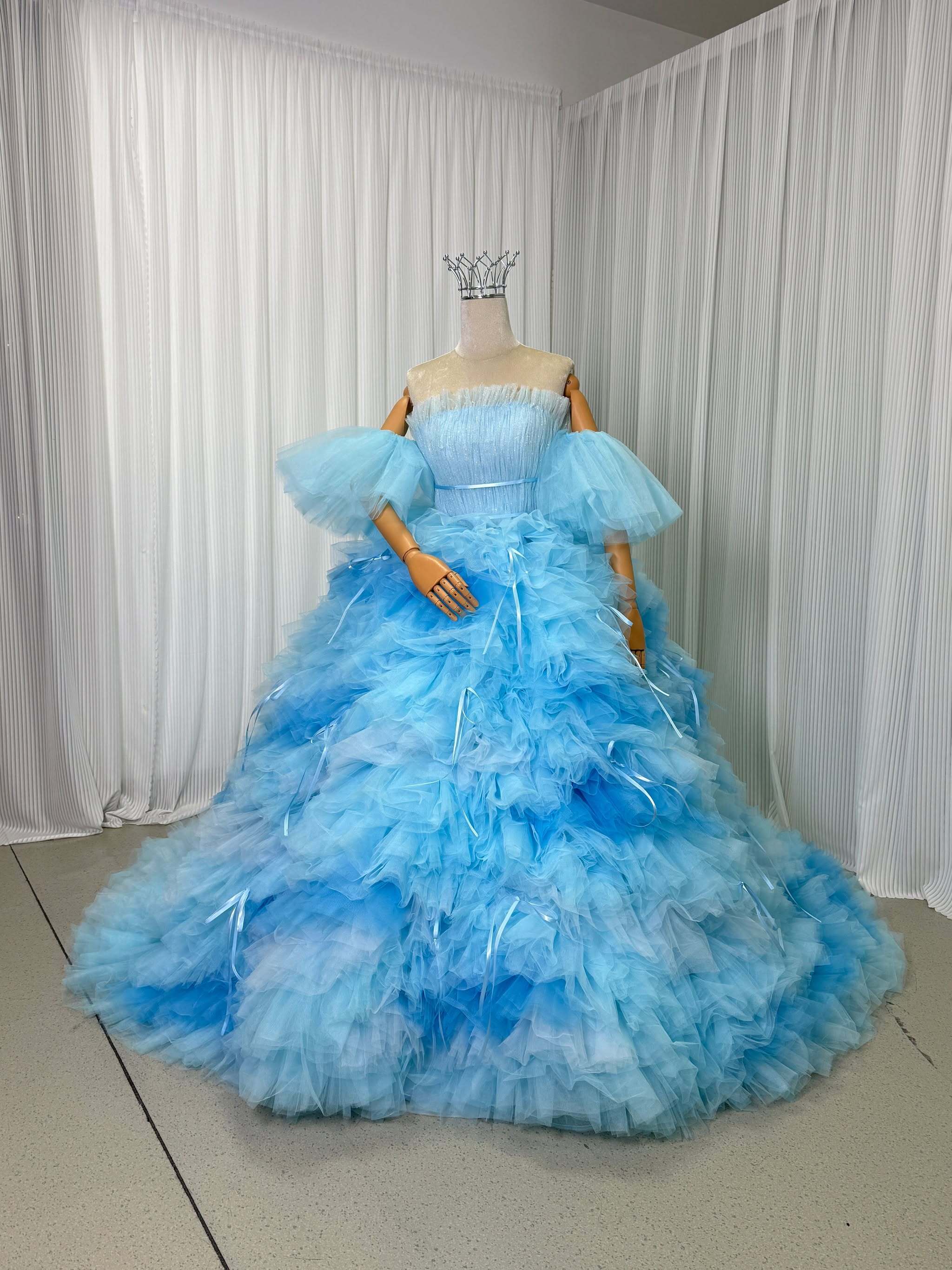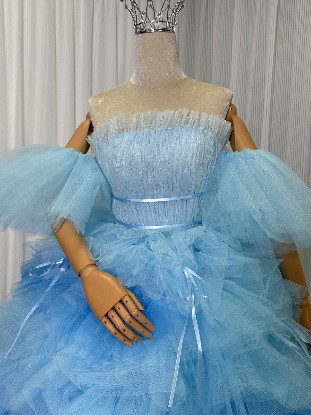 実例写真!カラードレス ブルー グラデーション パフスリーブ リボン 柔らかく重ねたチュールスカート 前撮り