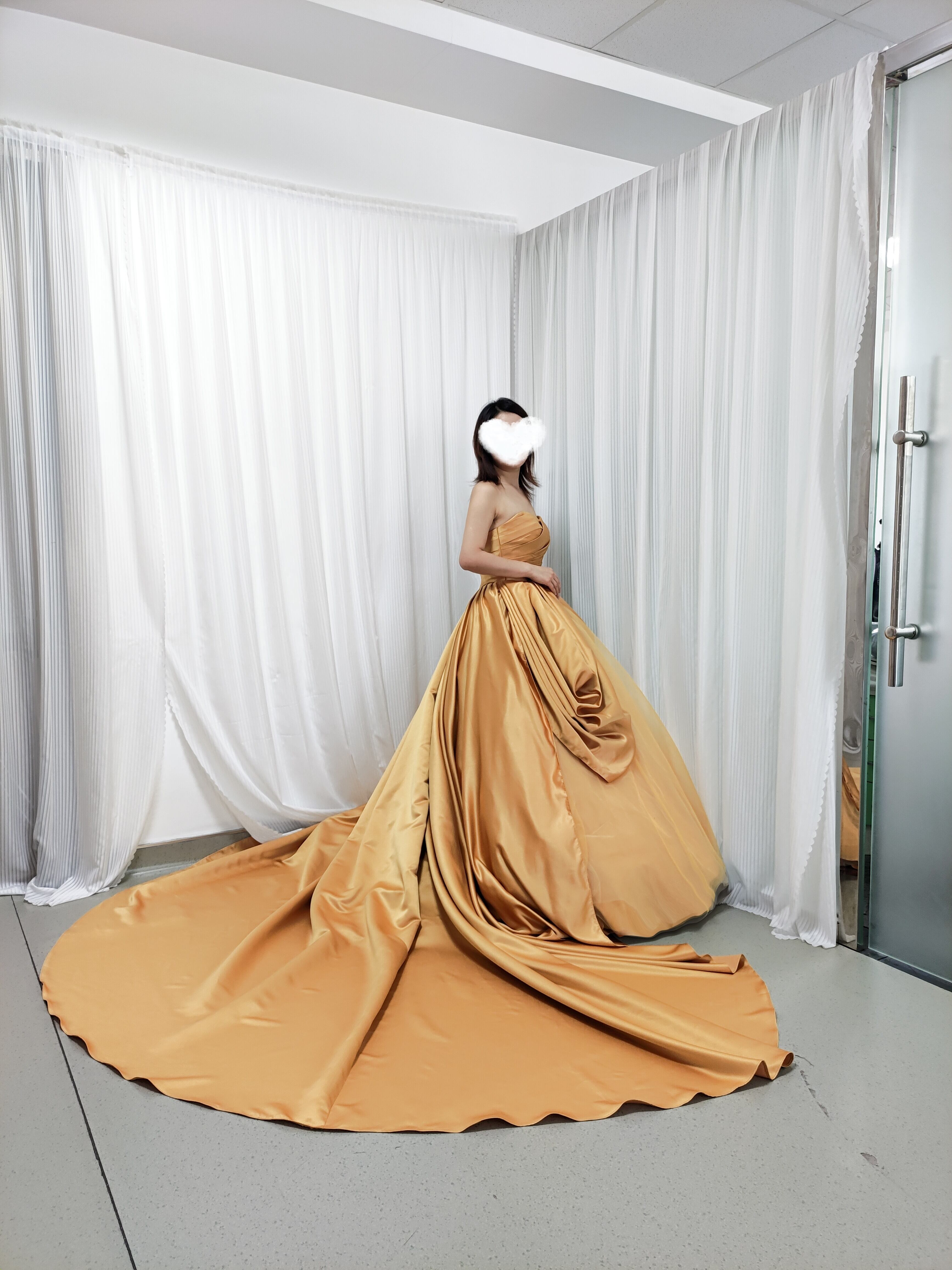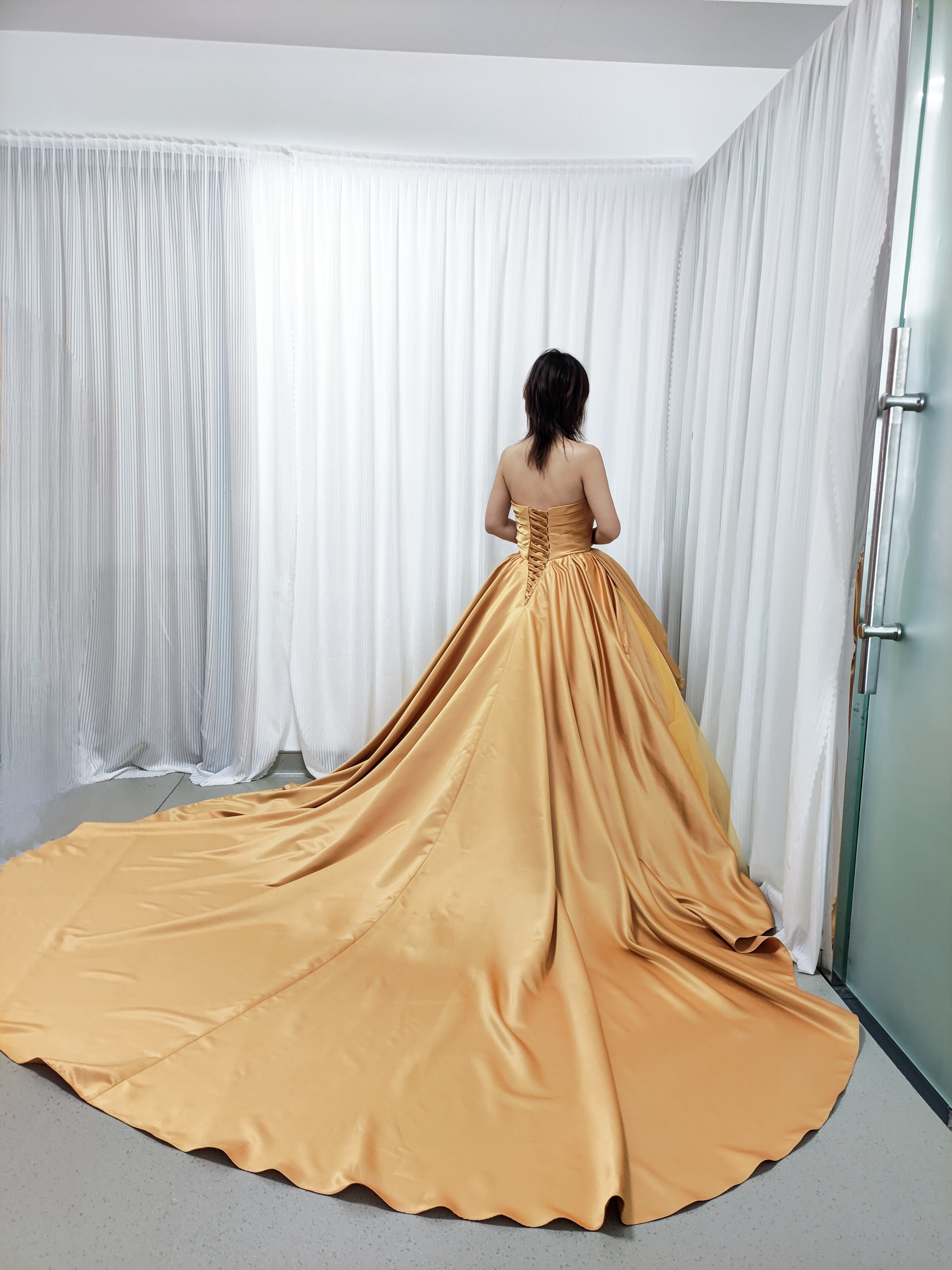 豪華!カラードレス イエロー ベアトップ 光沢サテン プリンセスライン デザイン感 編み上げ 抜群のおしゃれ見え