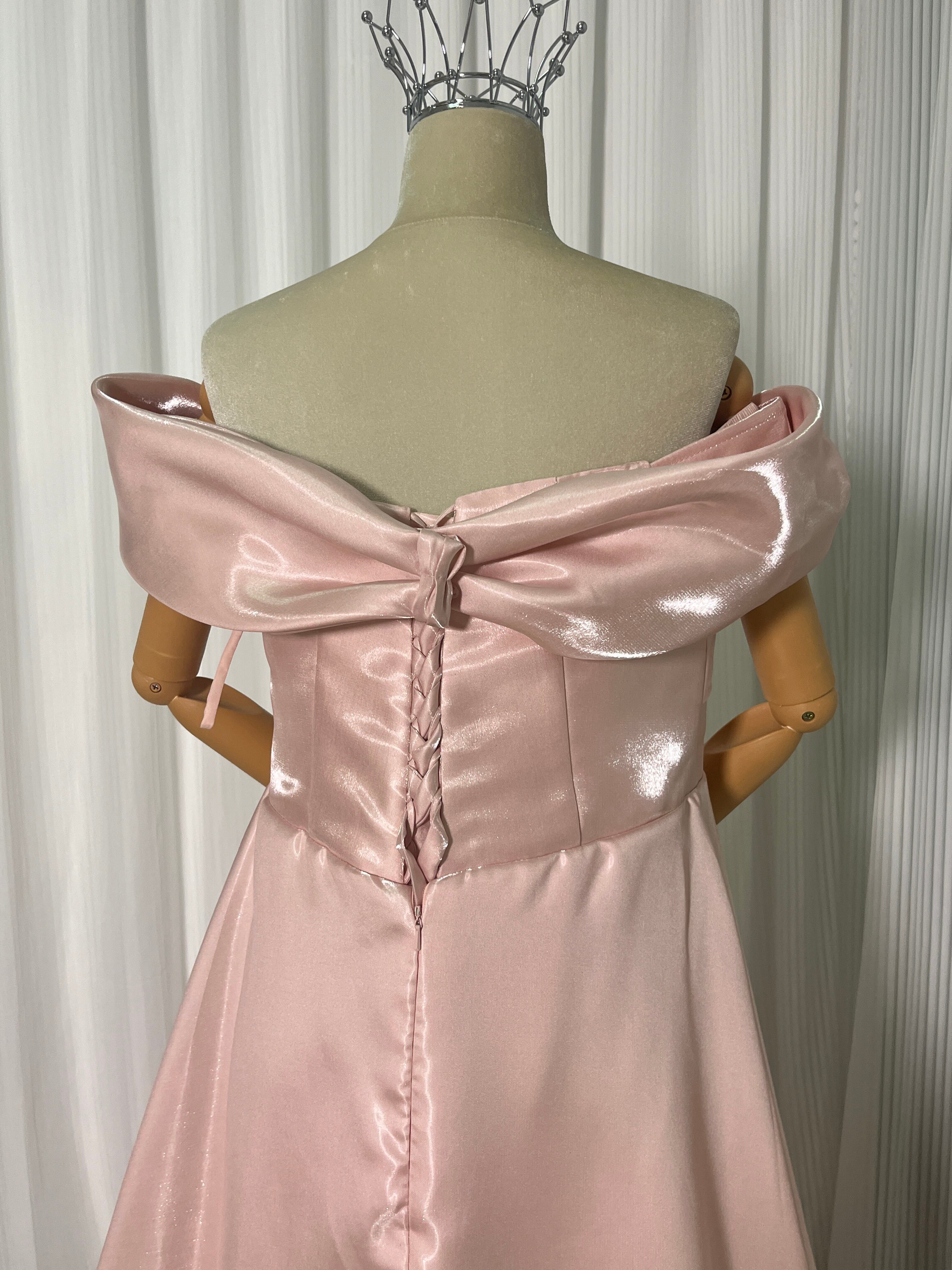 カラードレス コーラルピンク オフショルダー 光沢サテン ロング 前撮り 可愛い 編み上げ 演奏会/音楽会