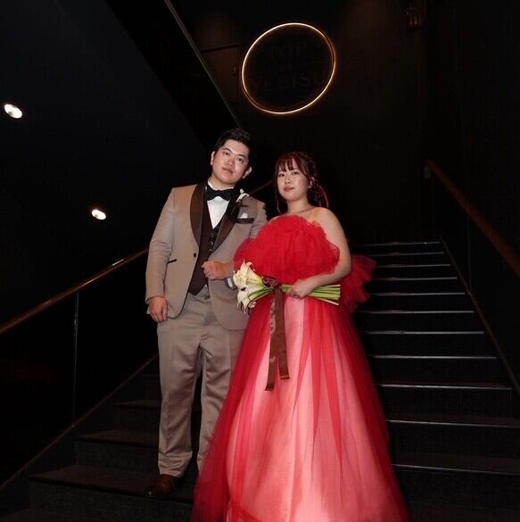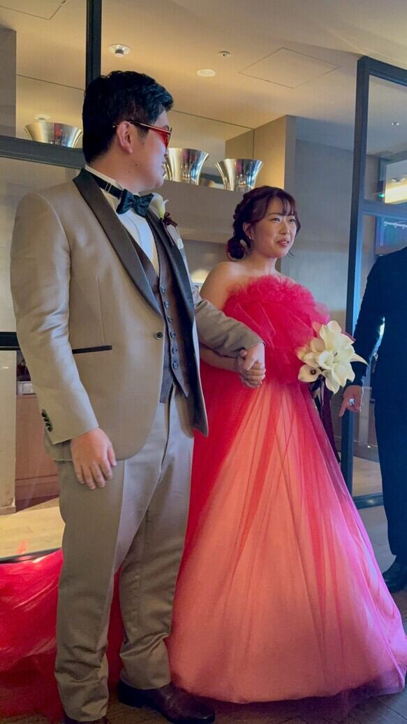 実例写真!オーバードレス ビビッドピンク キャミソール ビスチェタイプ ソフトチュール 可愛い カラードレス 花嫁 前撮り
