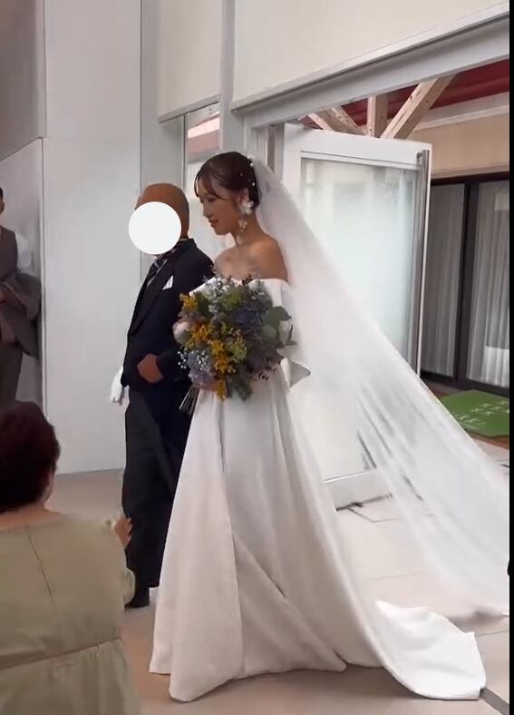 実例写真!エレガント ウェディングドレス オフショルダー クレープ生地 編み上げ 披露宴/結婚式 ふわふわ
