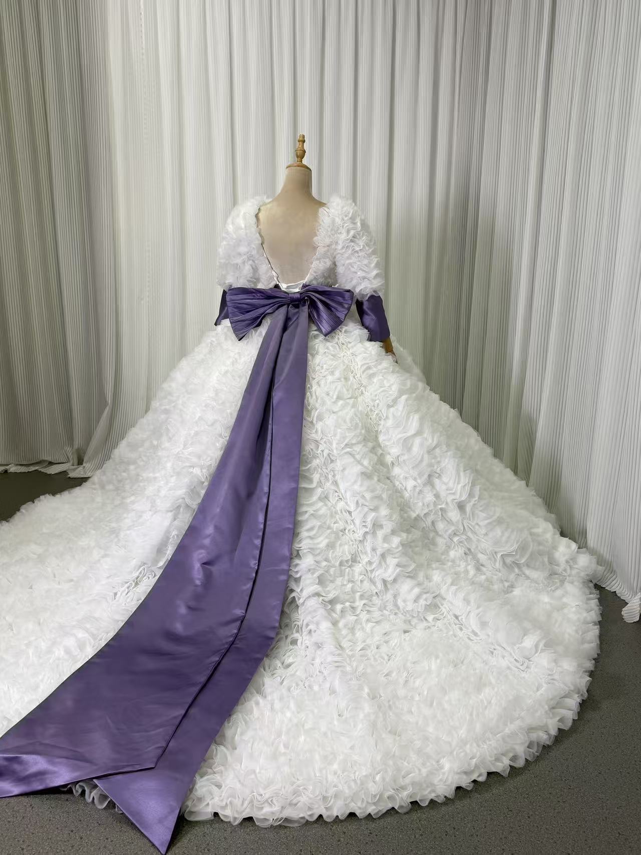 ウェディングドレス 長袖 Vネック リボン もこもこドレス ロングトレーン ボリュームドレス 拳式/前撮り