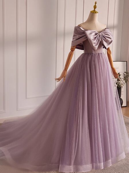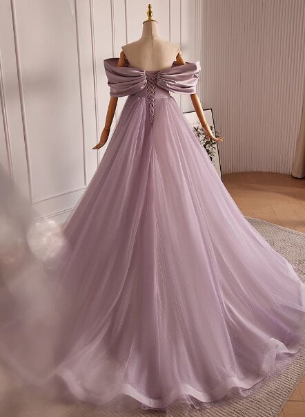 カラードレス パープル オフショルダー リボン ふわふわドレス ソフトチュール 編み上げ 演奏会/音楽会