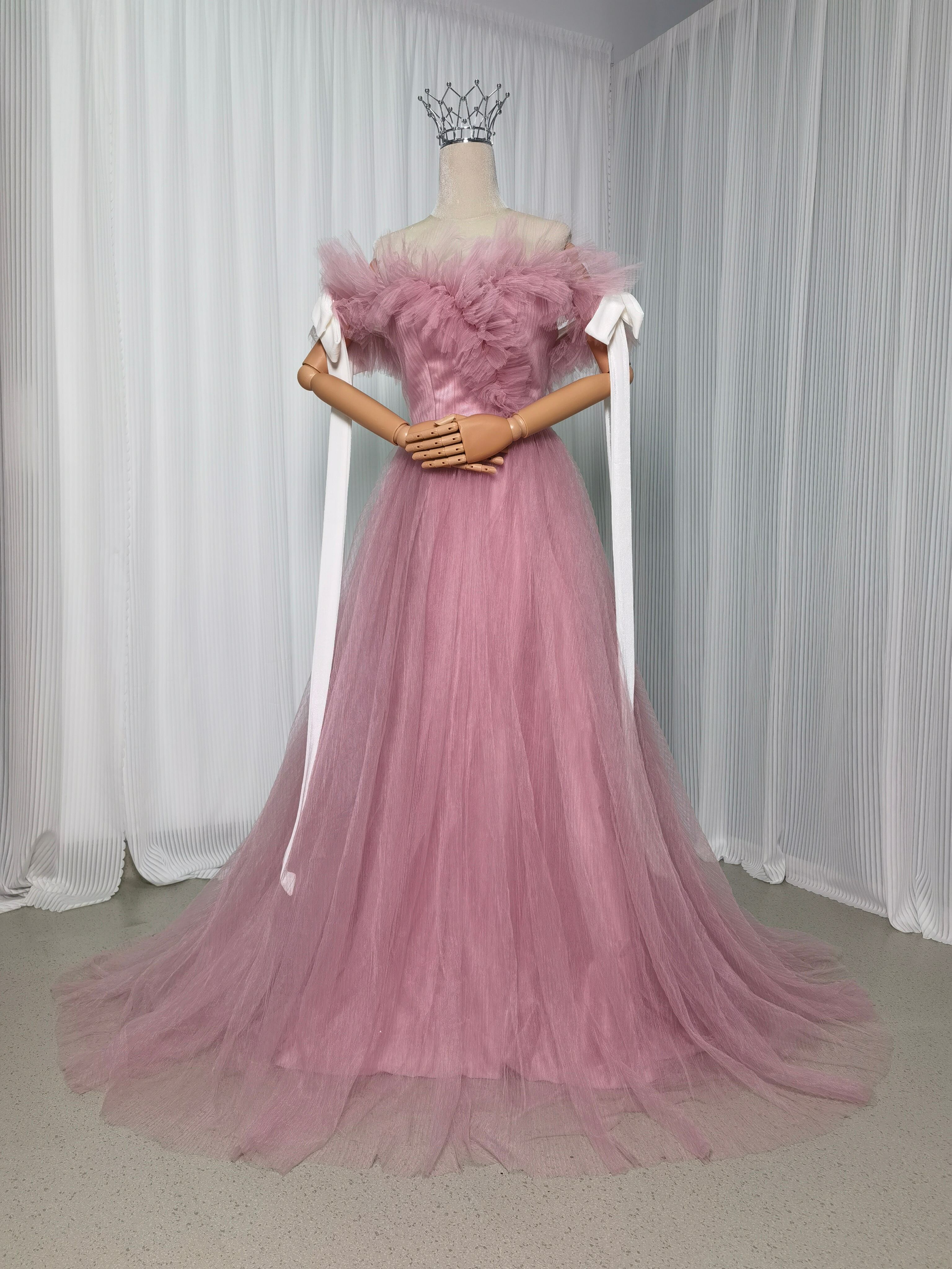 カラードレス ピンク オフショルダー プリーツドレス リボン 可愛い デザイン感 披露宴/結婚式