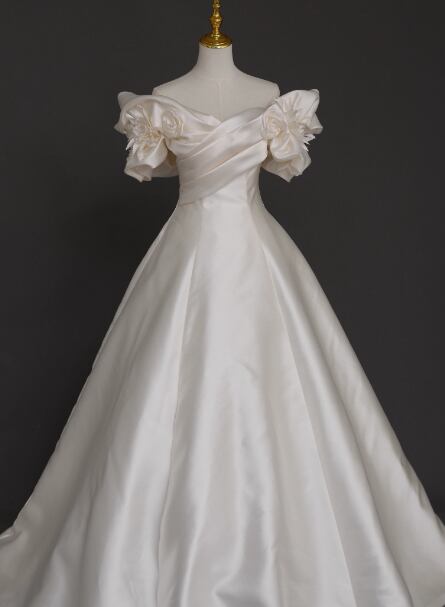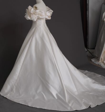 ウエディングドレス オフショルダー 花モチーフ ミカドサテン ロングトレーン 結婚式