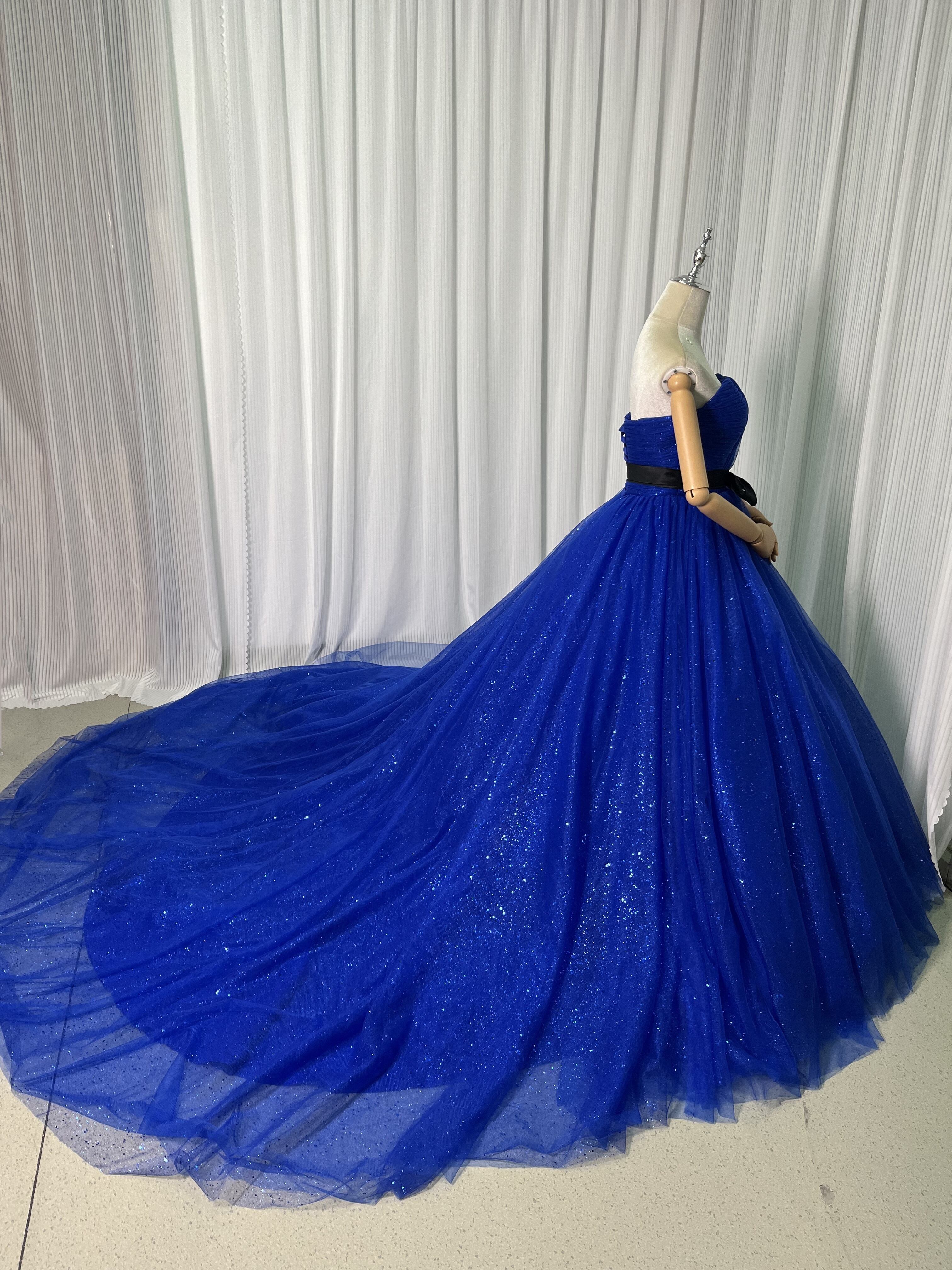 カラードレス ジュエルブルー ベアトップ キラキラチュール ベルト 編み上げ 披露宴