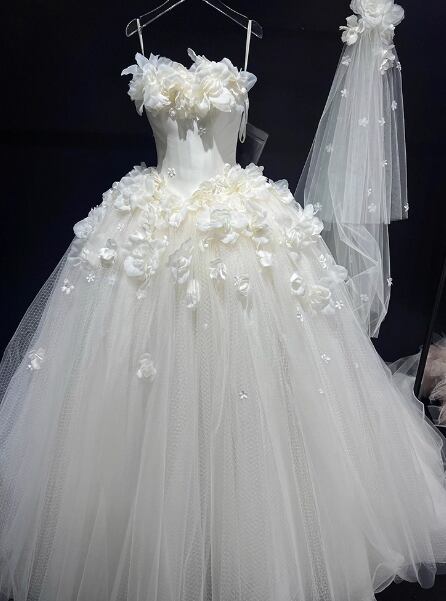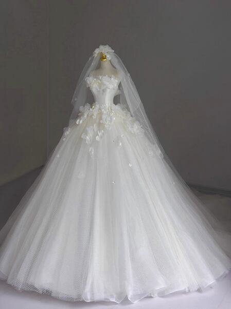 ウェディングドレス ベアトップ 美しい花レース 可愛い プリンセスライン ロングトレーン 結婚式