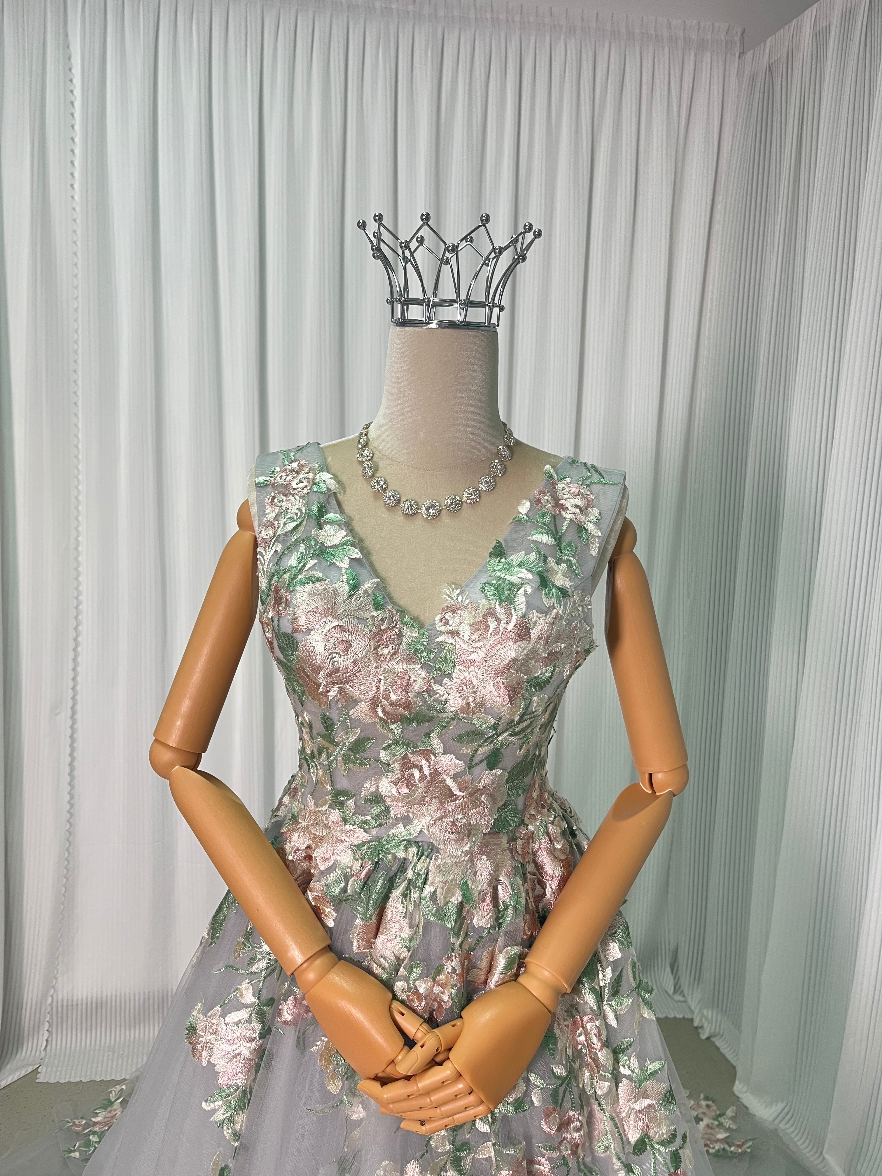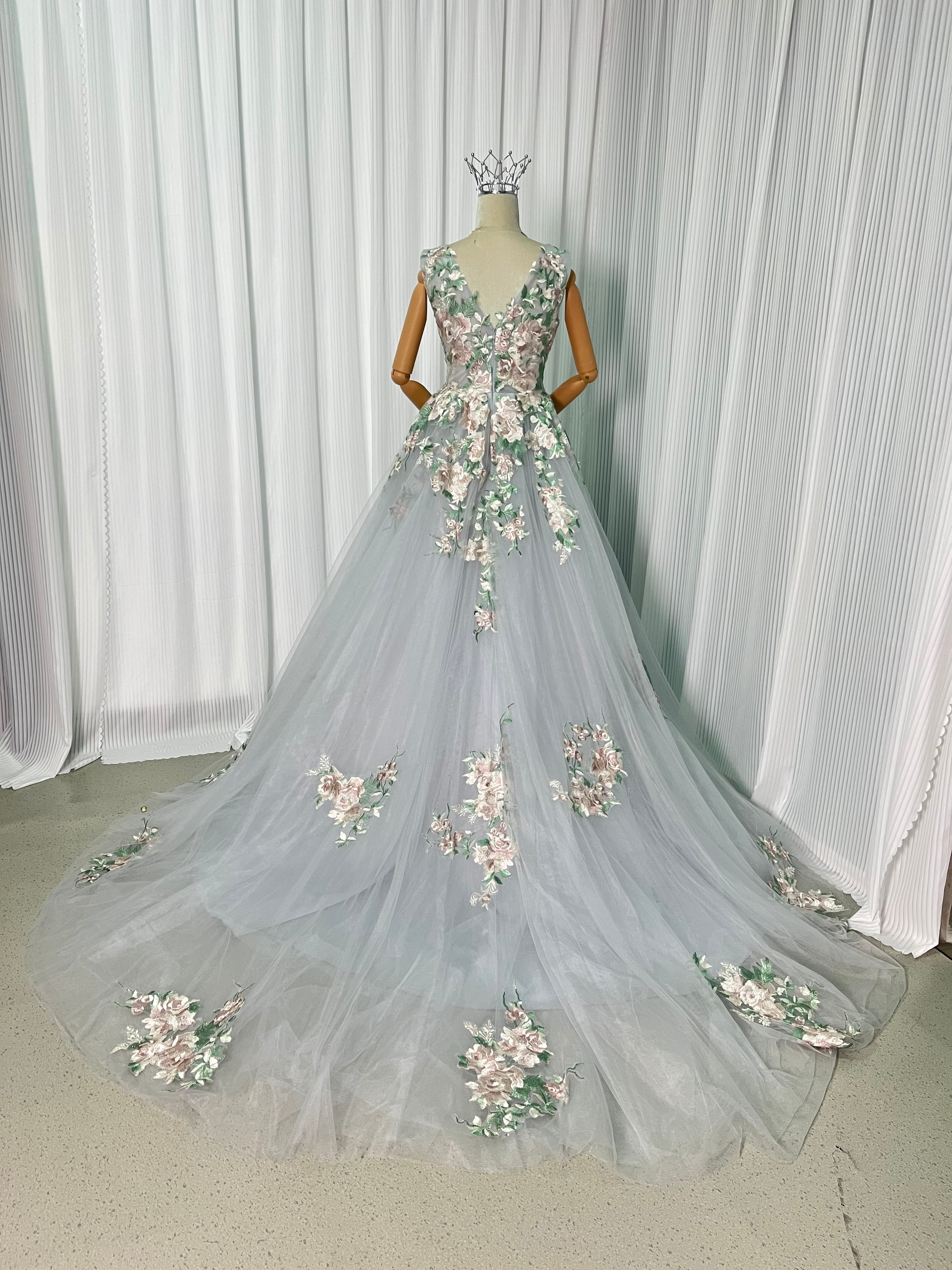 ウェディングドレス ブルーグレー ノースリーブ Vネック 花モチーフ ファスナー エレガント 優しい