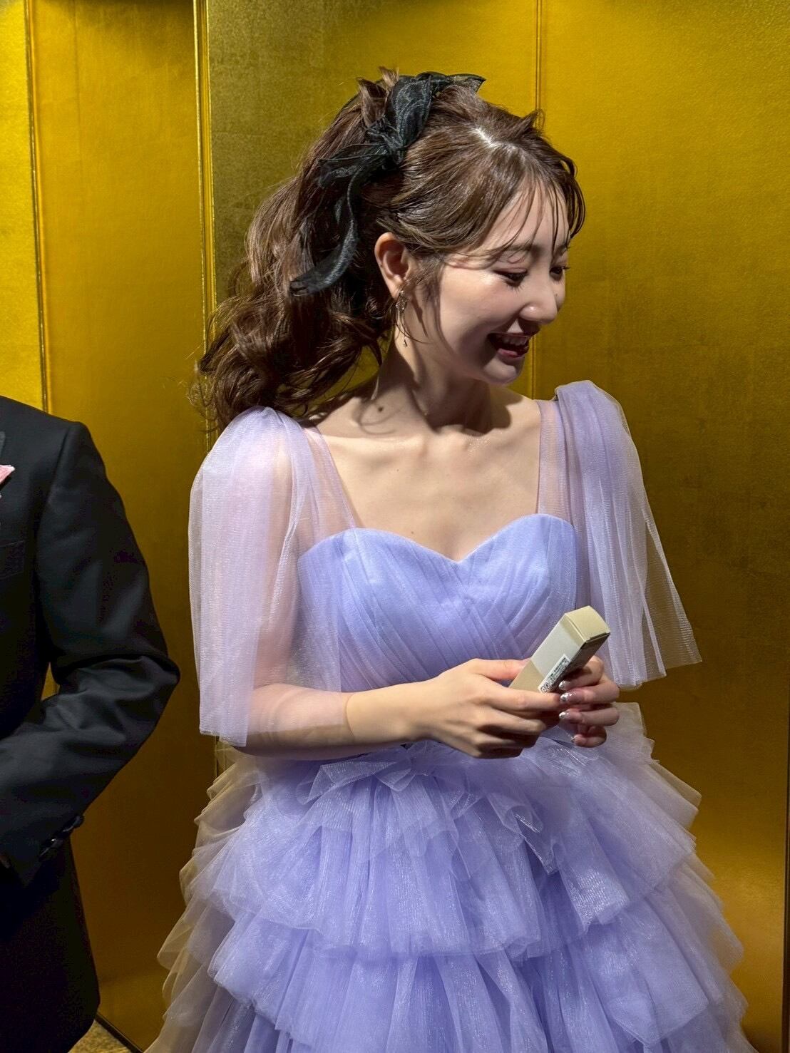 実例写真!華やか カラードレス パープル 柔らかく重ねたチュールスカート キャミソール 披露宴