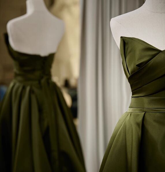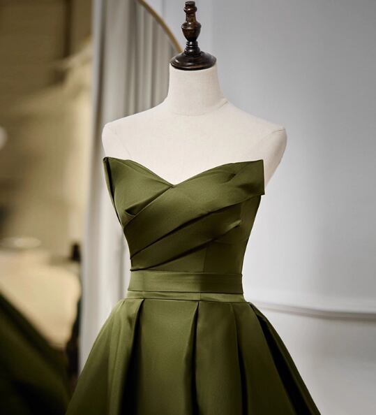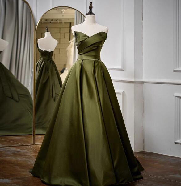 カラードレス グリーン ベアトップ 光沢サテン Aライン クラシカル 編み上げ 謝恩会