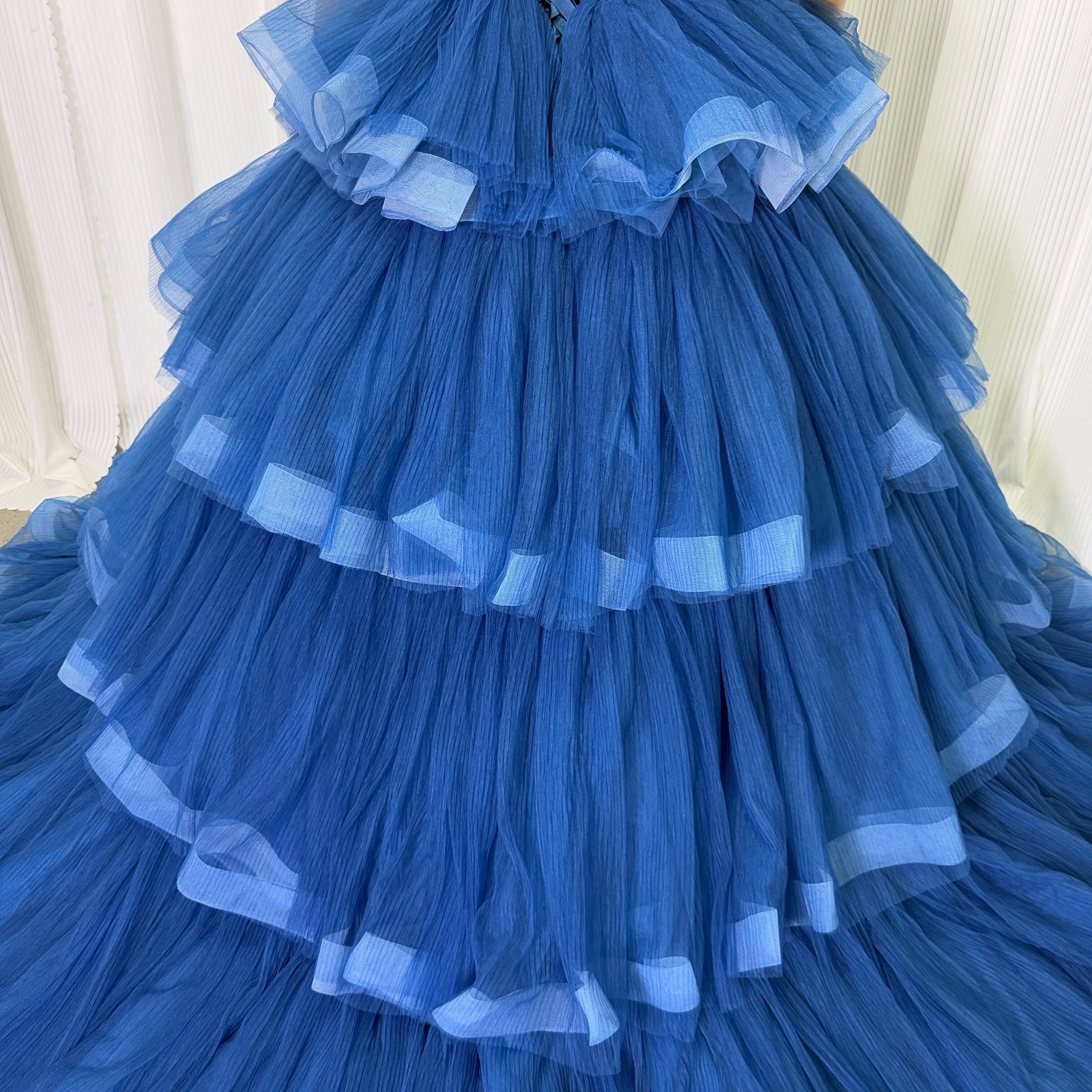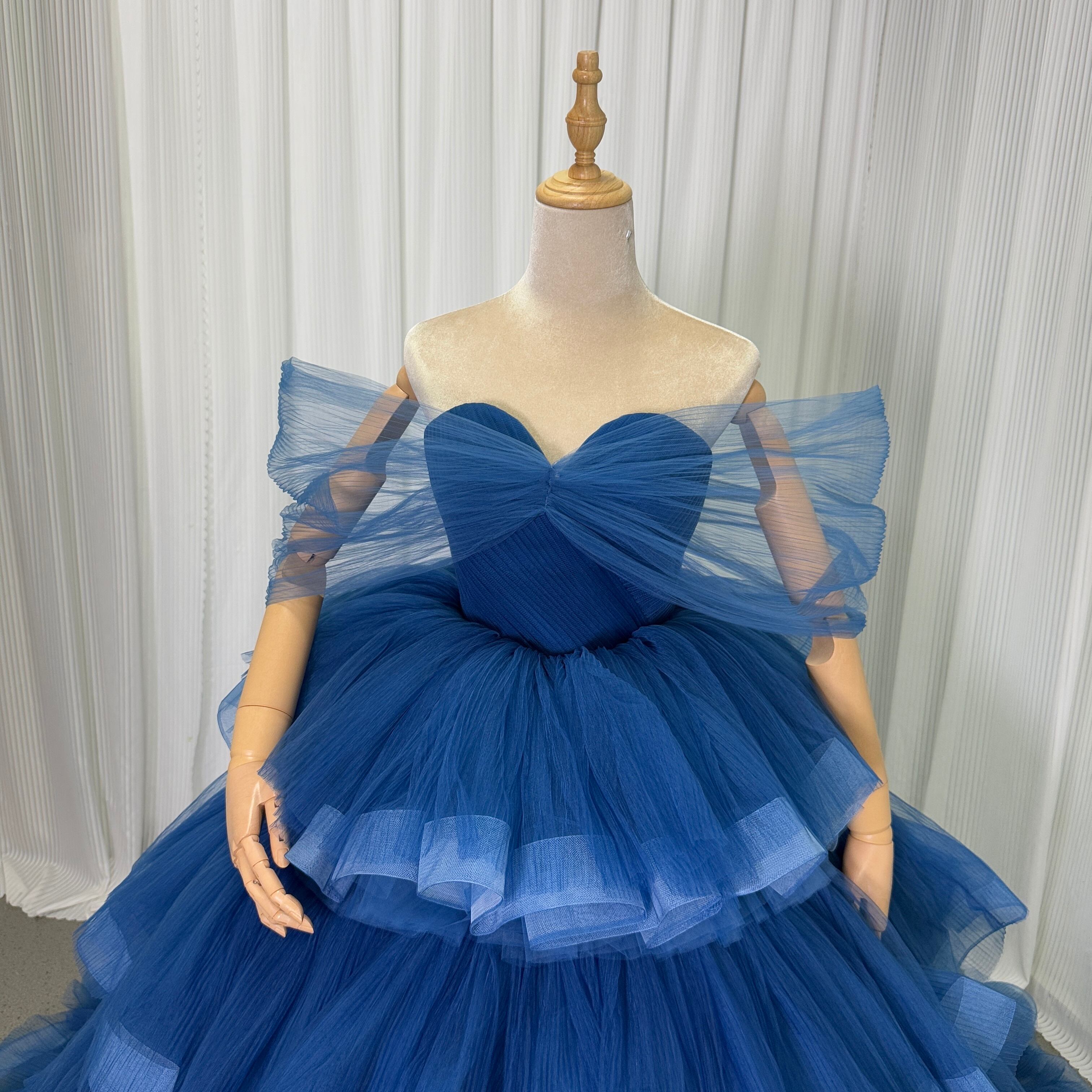華やか カラードレス ジュエルブルー オフショルダー ボリュームドレス プリーツスカート 花嫁