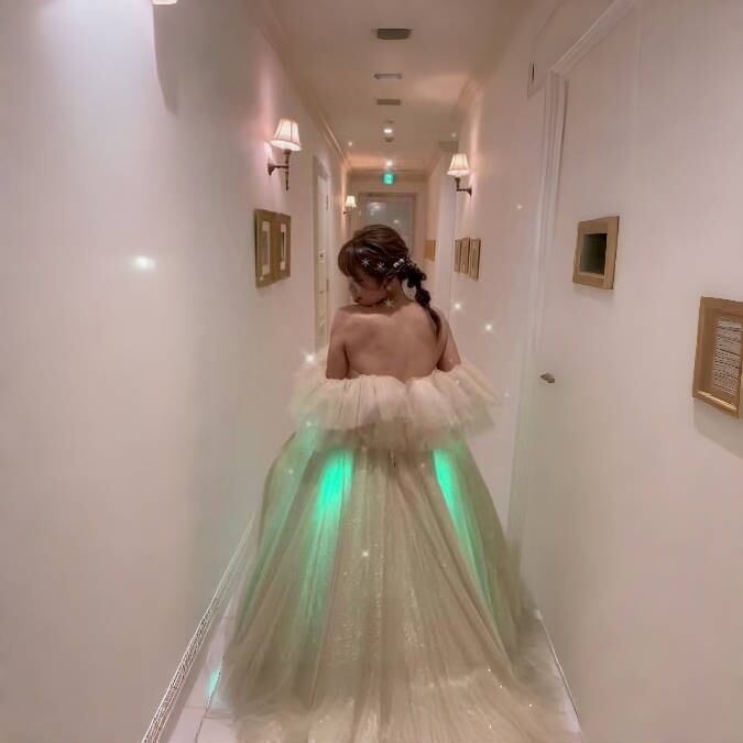 実例写真!人気上昇!カラードレス シャンパン色 オフショルダー キラキラグリッターチュール 編み上げ 前撮り