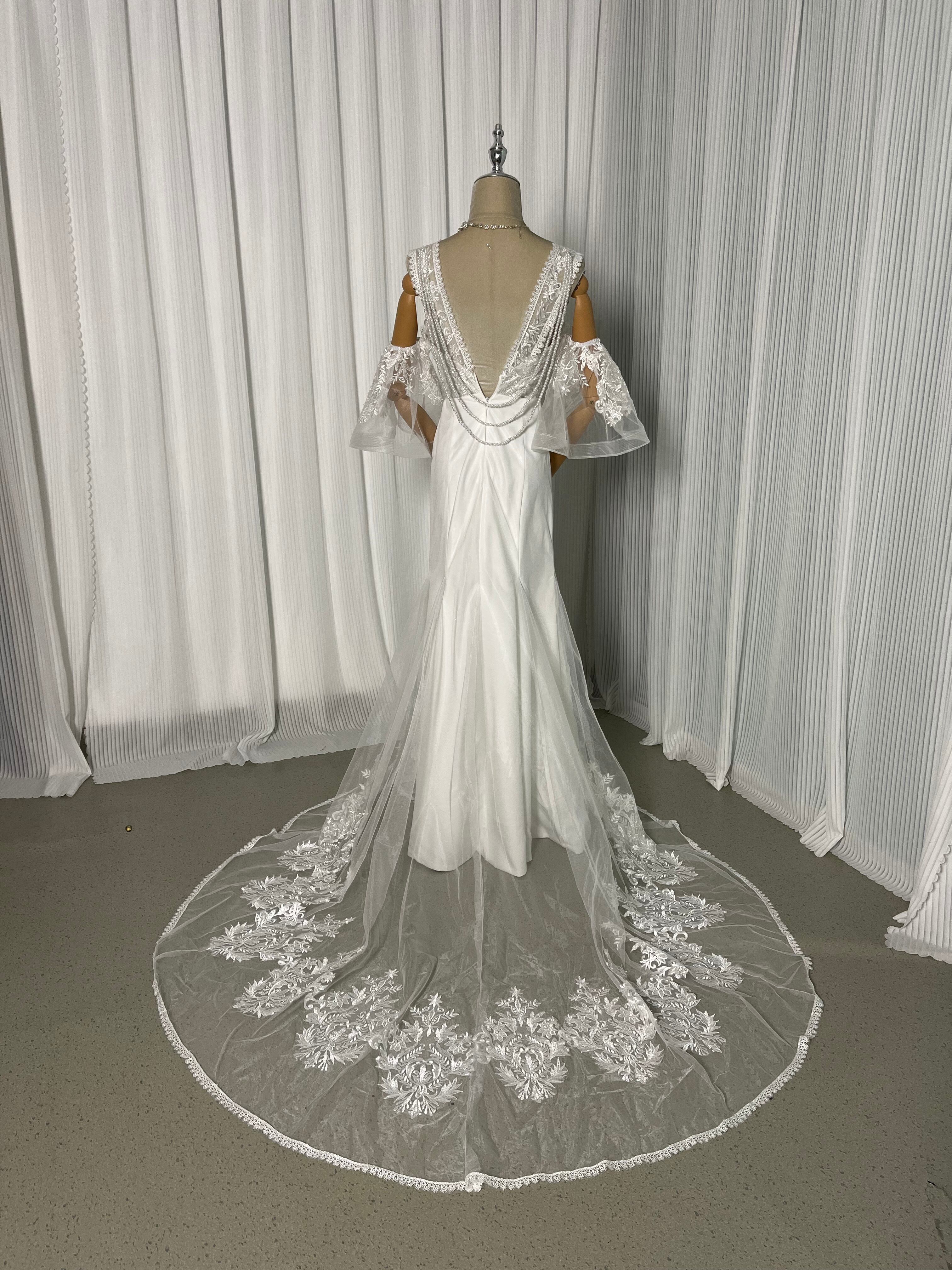 美品!ウェディングドレス キラキラスパンコール ふわふわ袖 裾に繊細レースをあしらった マーメイドライン 結婚式 前撮り