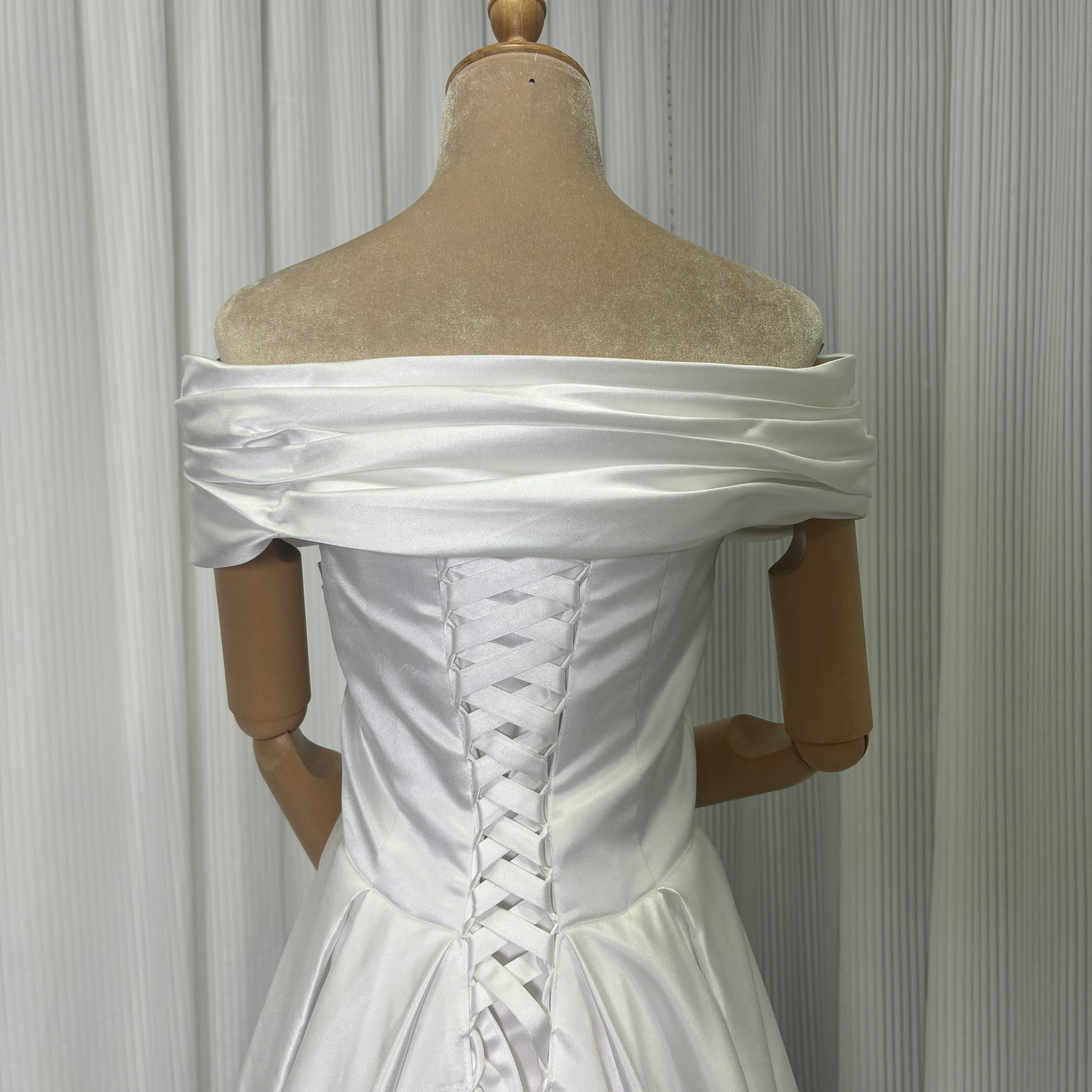 ウエディングドレス オフショルダー ロングトレーン 光沢サテン くるみボタン 編み上げ 結婚式
