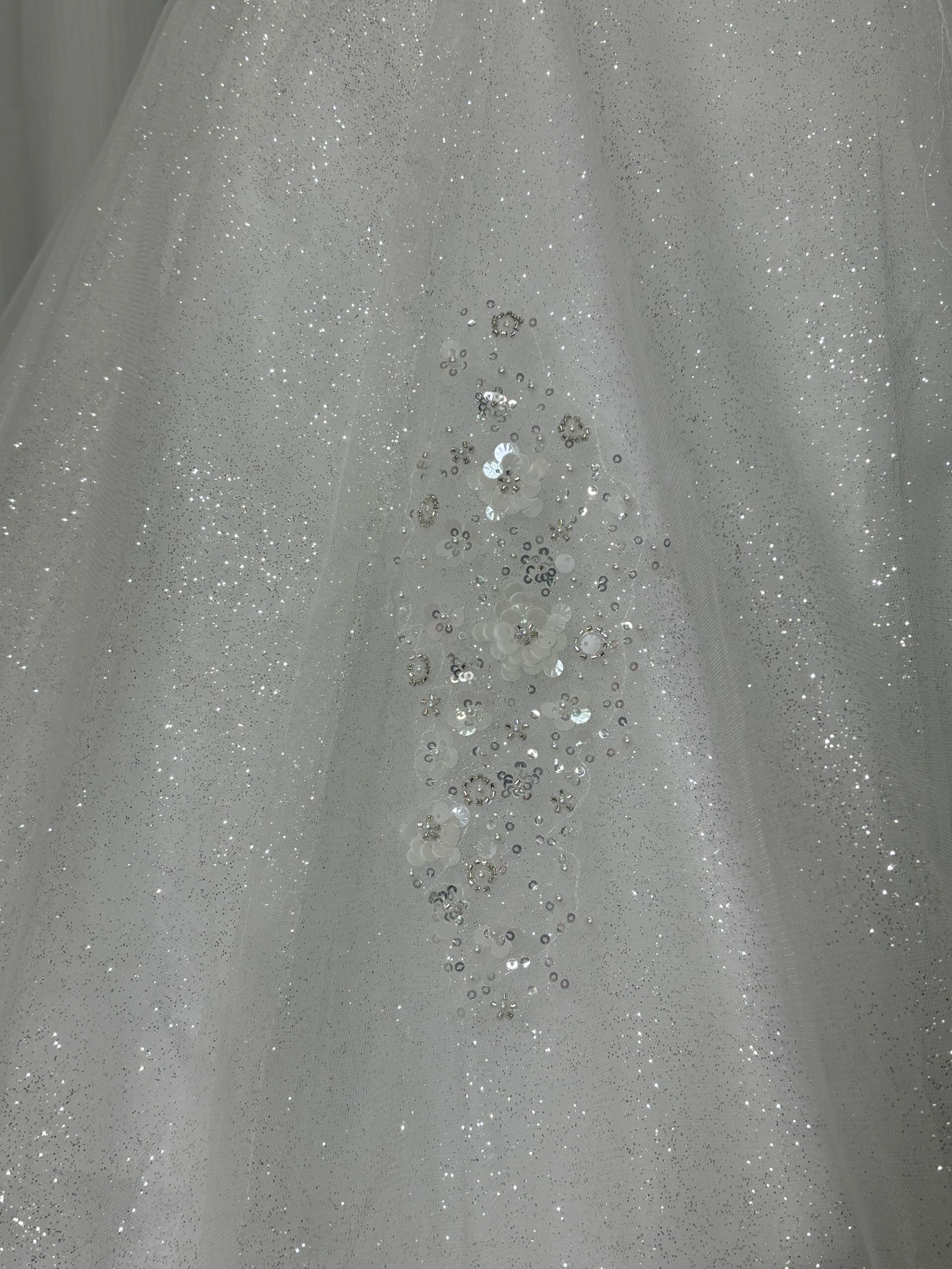 実例写真!ウエディングドレス 3D立体レース刺繍 半袖 キラキラグリッターチュール マーメイドライン くるみボタン 結婚式