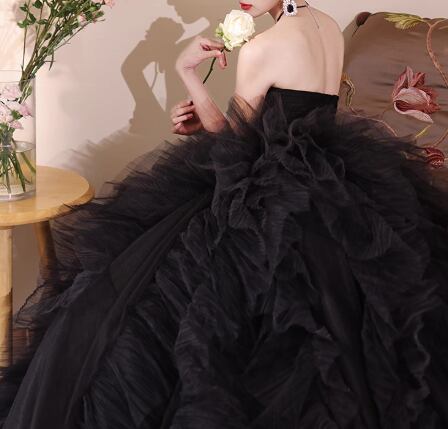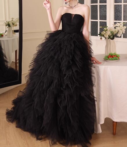 パーティードレス ブラック ベアトップ プリーツスカート 柔らかく重ねたチュールスカート 前撮り