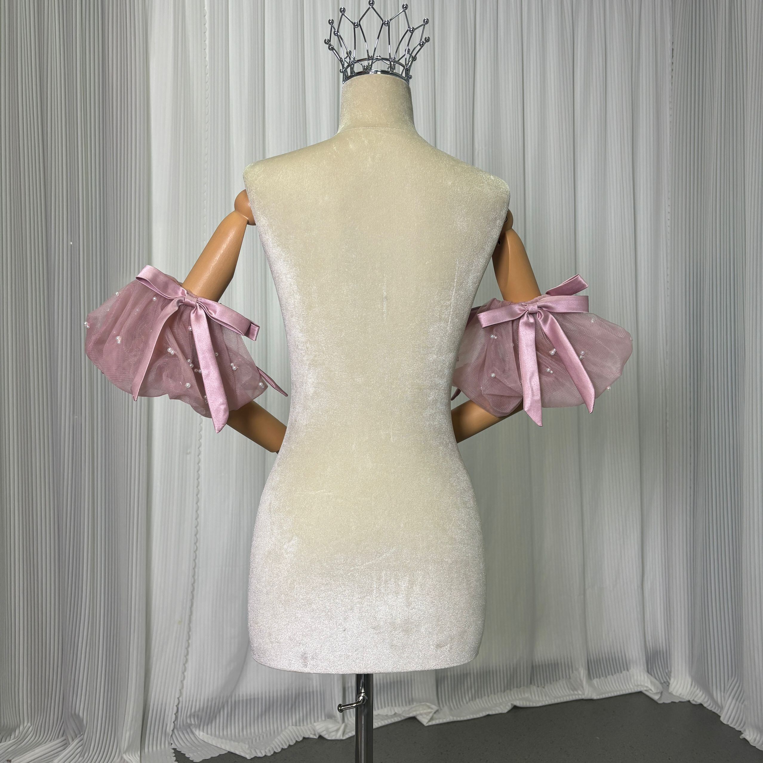 実例写真!パフスリーブ ピンク パール リボン ストレッチ 可愛い 結婚式/披露宴